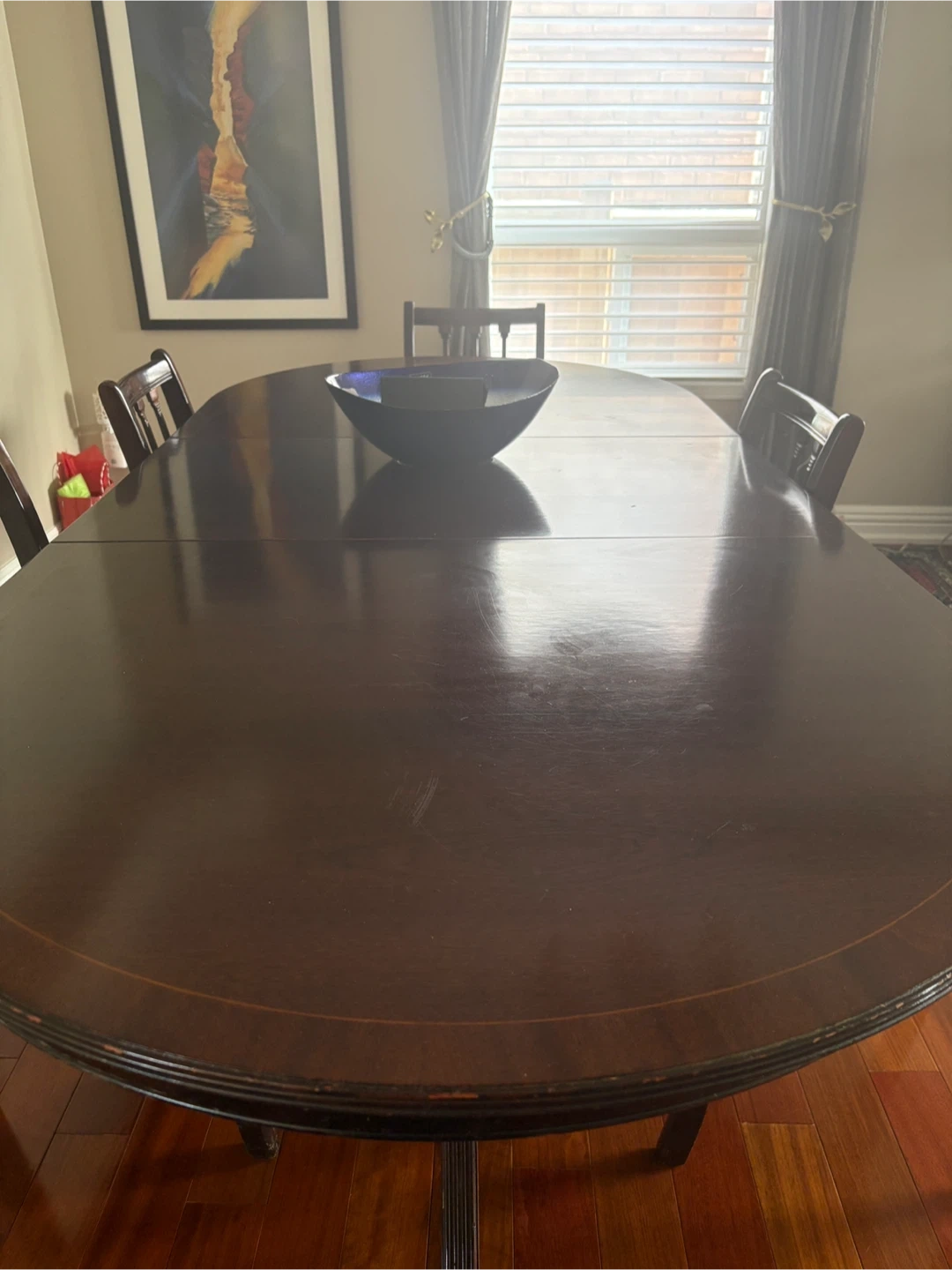 This dining chair features a dark wood frame and a seat upholstered in a red, cream, and gold striped fabric. It's a classic design that would complement a formal dining room. The chair's construction is solid, and it's ready to be used at your dining table. 2 chairs need to be re glued. Pick up in Whitby