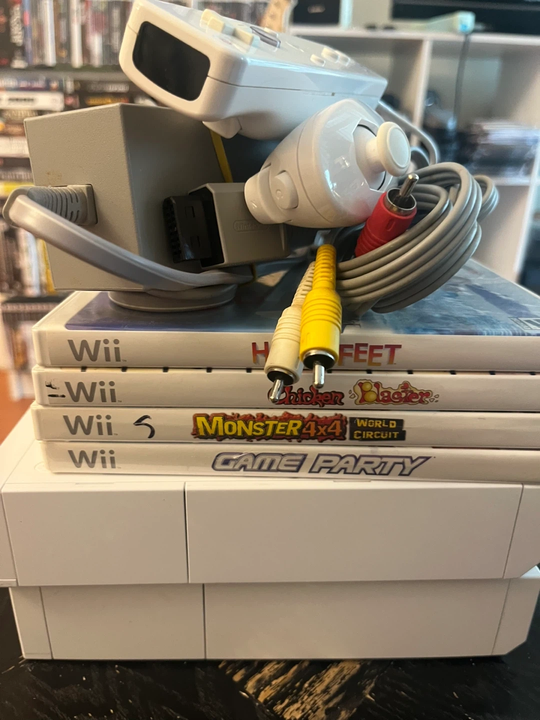 Includes Nintendo Wii console and four games: High Score Feet, Chicken Blaster, Monster 4x4 World Circuit, and Game Party. Comes with controllers and AV cables.