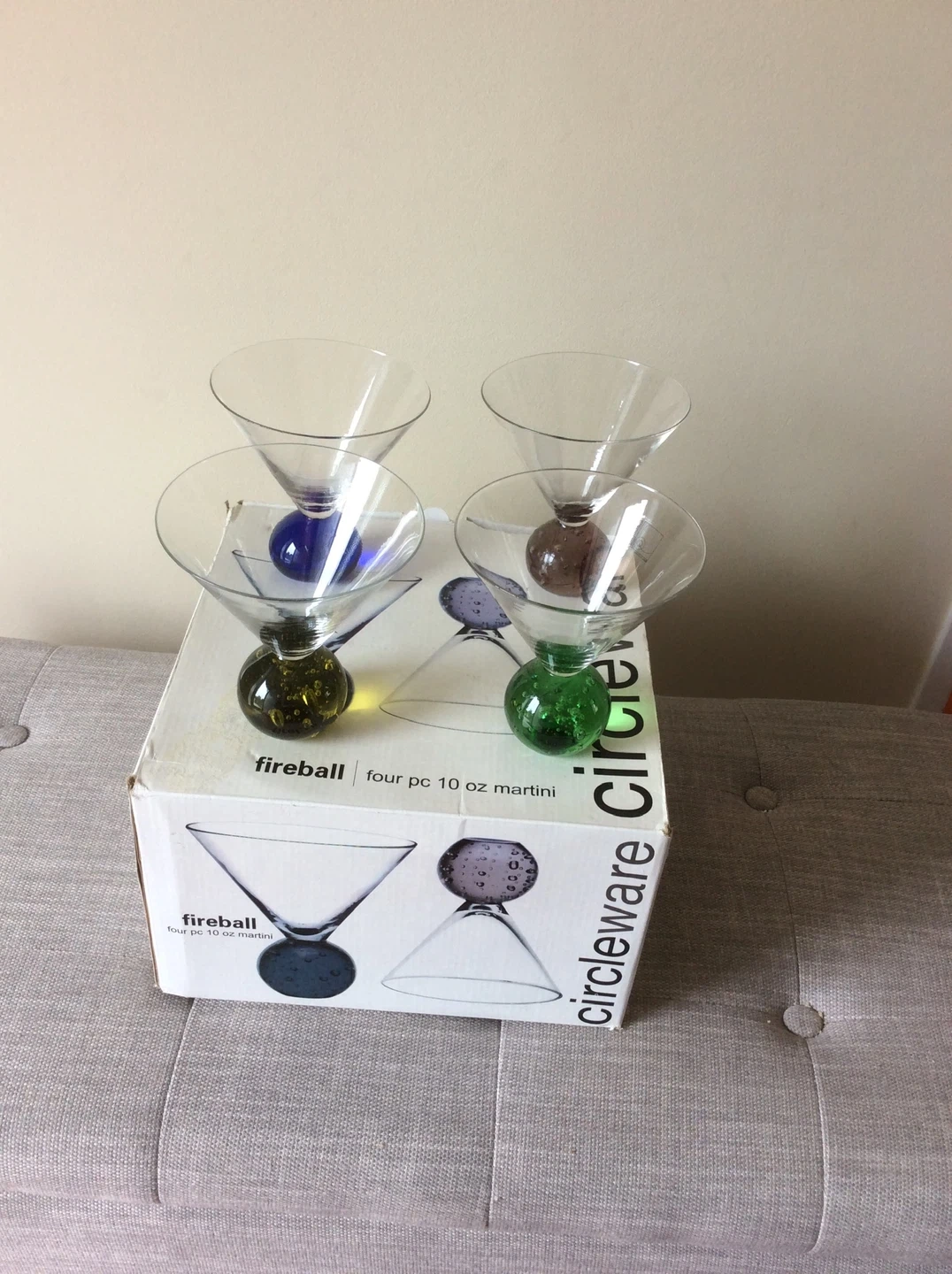 This is a set of four 10 oz Circleware Fireball martini glasses. Each glass features a unique colored bubble ball at the base, with colours including blue, brown, green, and dark grey. They're made of clear glass.