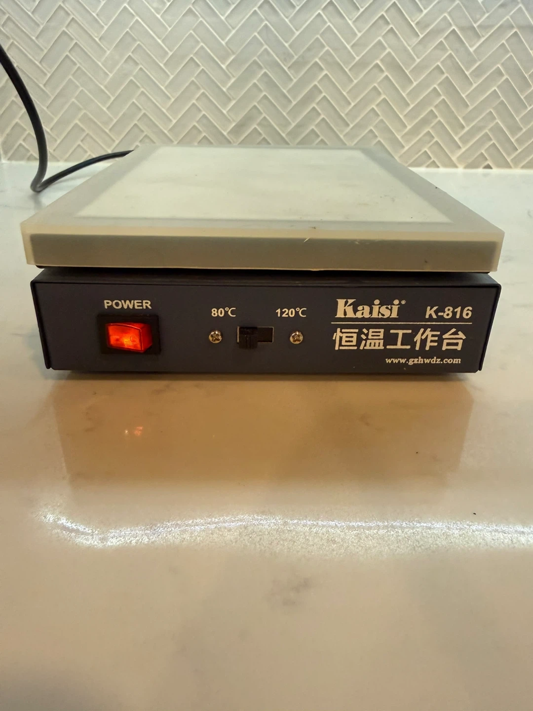 This Kaisi K-816 heating plate provides stable temperature control for various uses. It offers two temperature settings, 80°C and 120°C, powered by a standard electrical cord. The heating surface is approximately 9 inches by 5.5 inches.