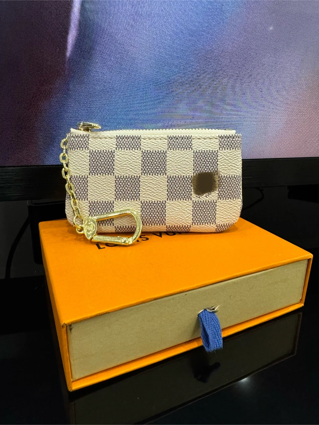 This Louis Vuitton key pouch features the classic Damier Azur checkered canvas. It has a gold-tone zipper and a d-ring clip. Includes the original Louis Vuitton orange box.