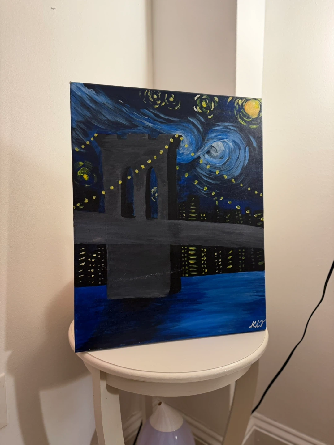 Acrylic painting of the Brooklyn Bridge with a starry night sky. Features a dark canvas with blue, black, gray, and yellow acrylic paints. Hand-painted.