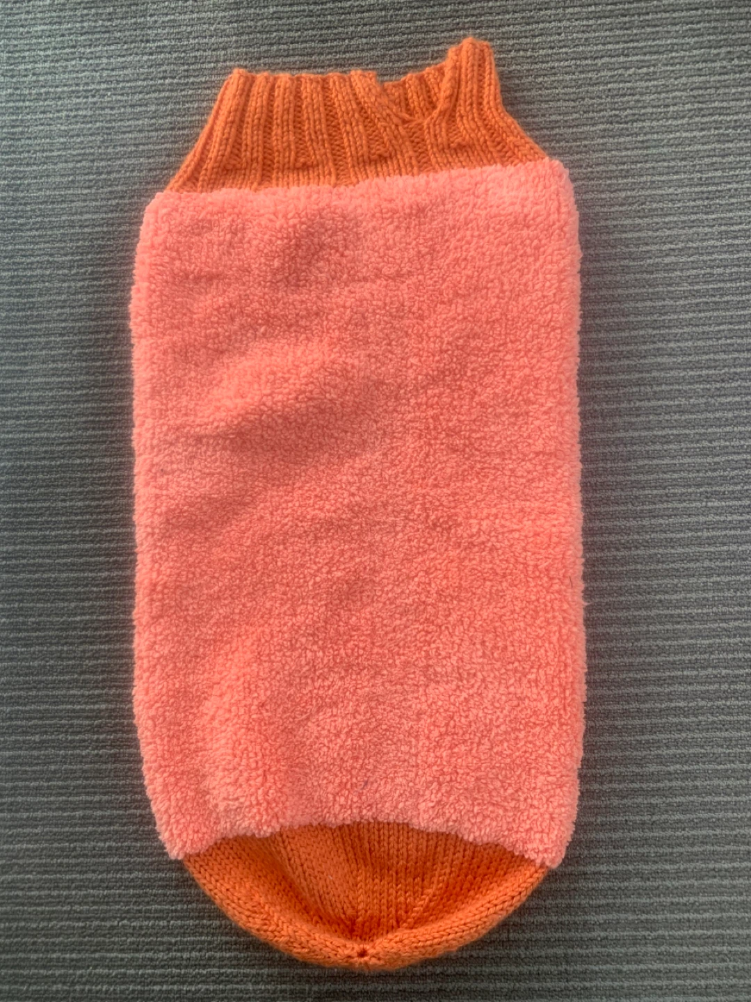 Includes a knitted purple and white striped onesie, an orange knitted bunting, a crocheted striped blanket, and a hooded baby towel with fish detail.
