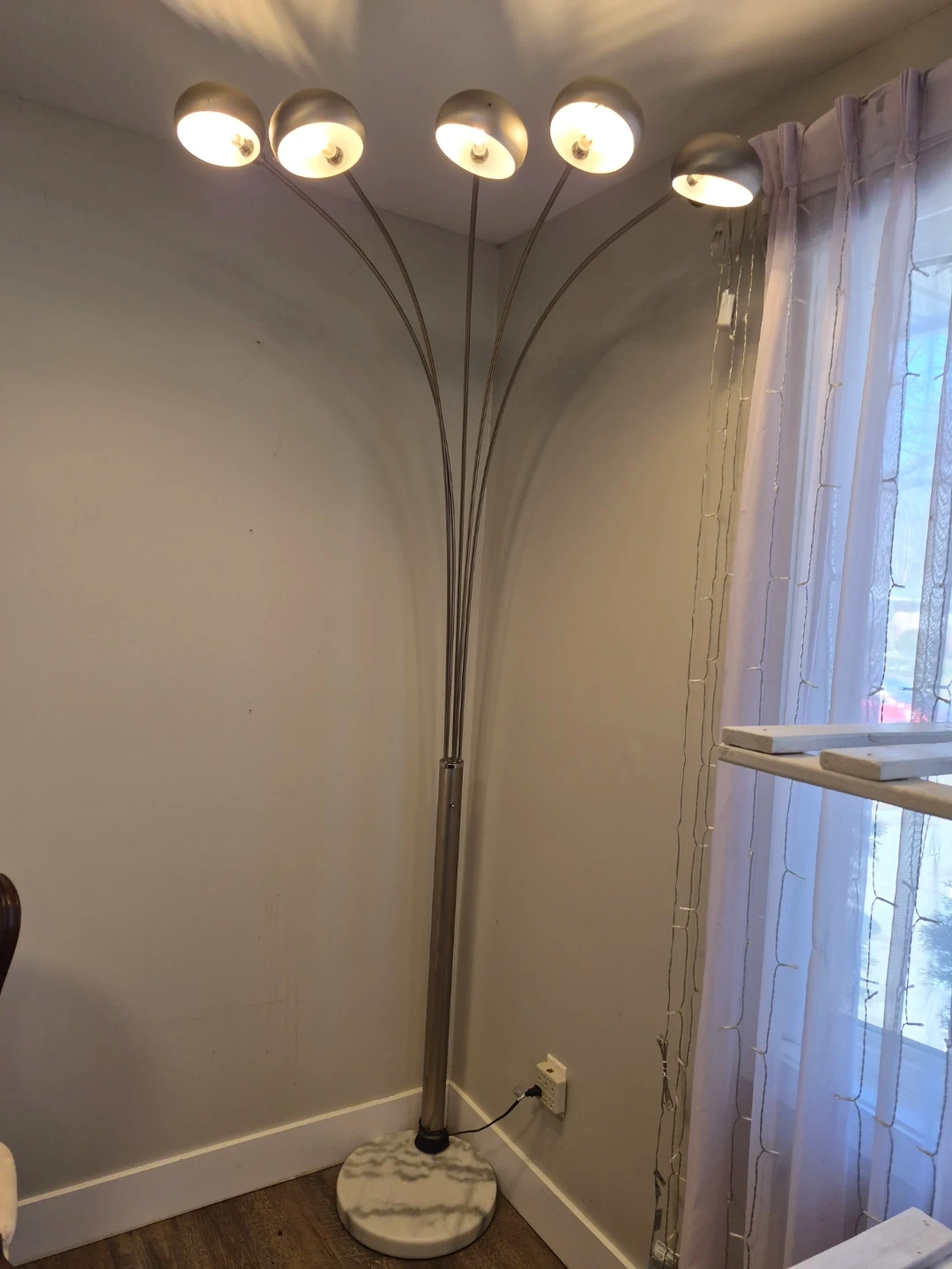 This is a silver arc floor lamp with five adjustable lights. It has a marble base for stability. The lamp's arc design is great for lighting up a reading nook or a seating area without needing multiple lamps.