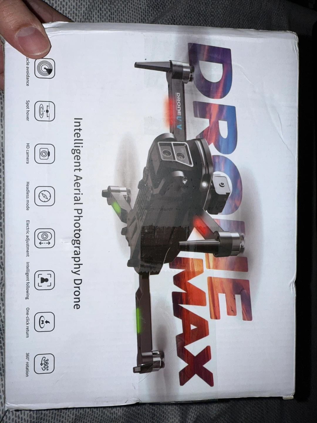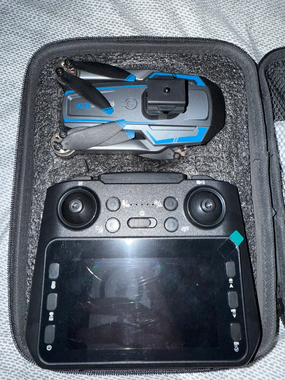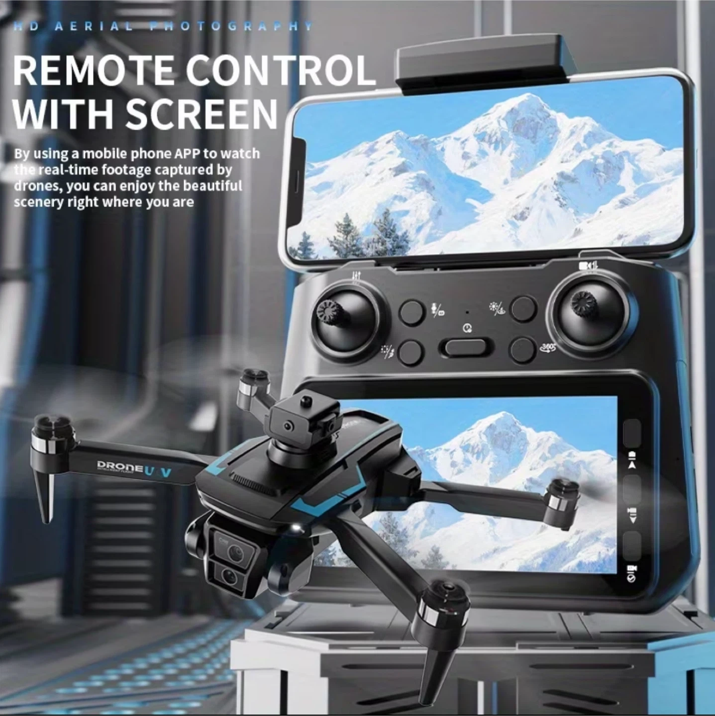 Selling a Drone U V, perfect for high-definition aerial photography! It features a large-screen remote control, electrically adjustable lens, and a brushless motor. The drone also has 360° intelligent obstacle avoidance. Included are the charging cable, storage bag, instruction manual, screws, fan blades, and battery. The dimensions are approximately 28cm x 27cm x 8cm.