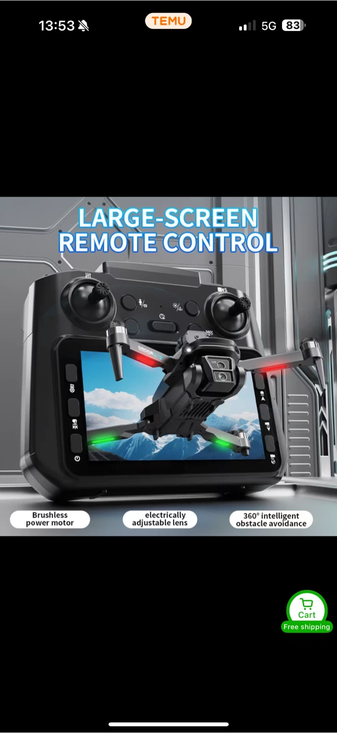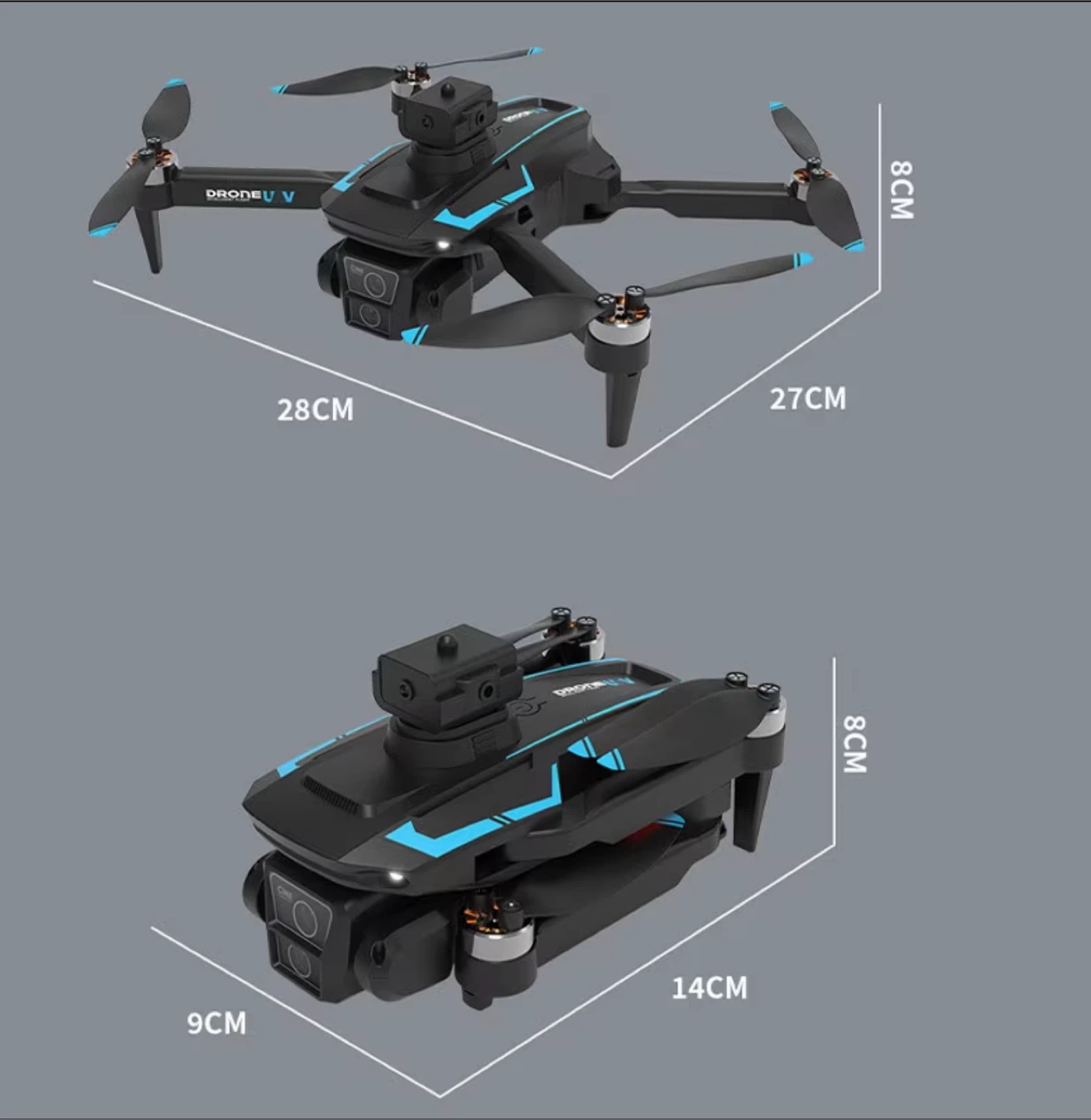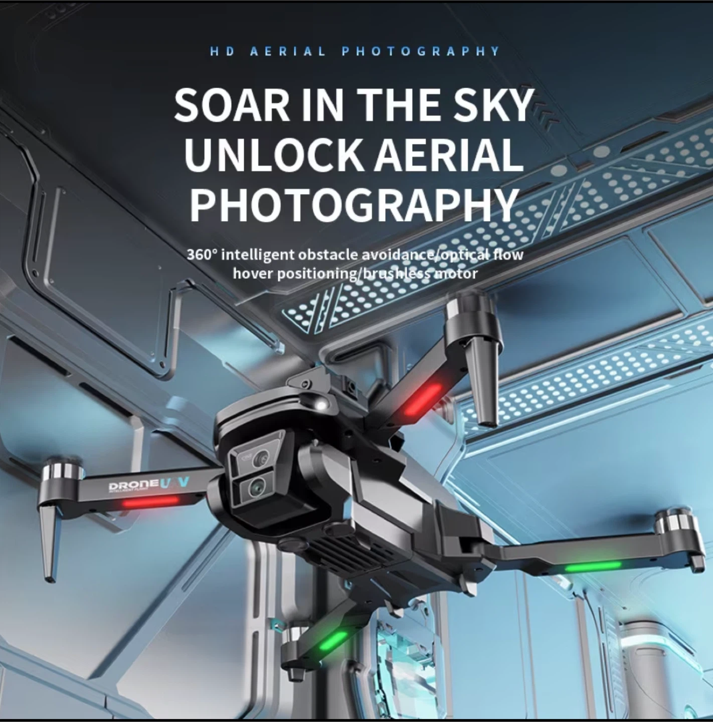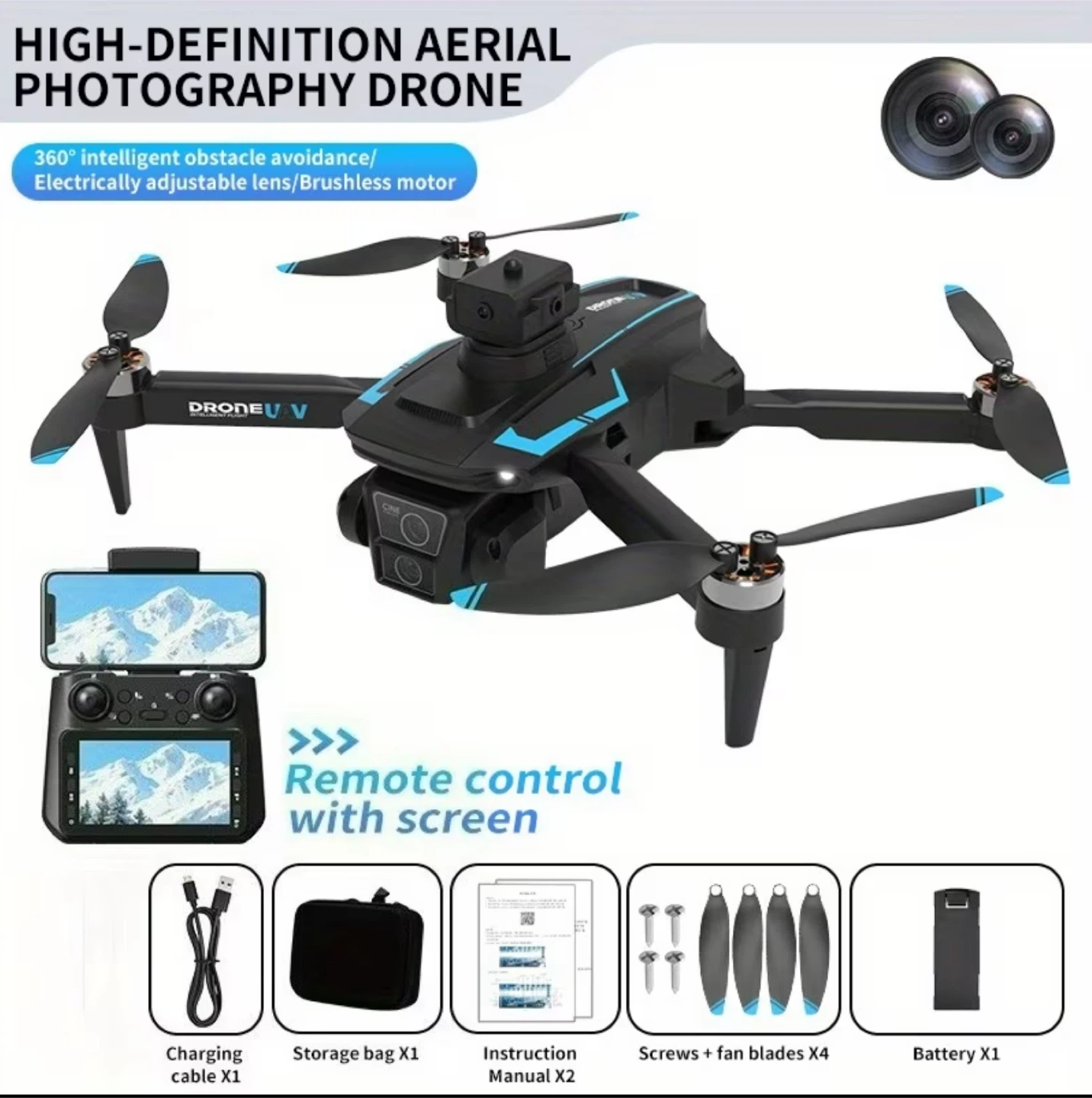 Selling a Drone U V, perfect for high-definition aerial photography! It features a large-screen remote control, electrically adjustable lens, and a brushless motor. The drone also has 360° intelligent obstacle avoidance. Included are the charging cable, storage bag, instruction manual, screws, fan blades, and battery. The dimensions are approximately 28cm x 27cm x 8cm.