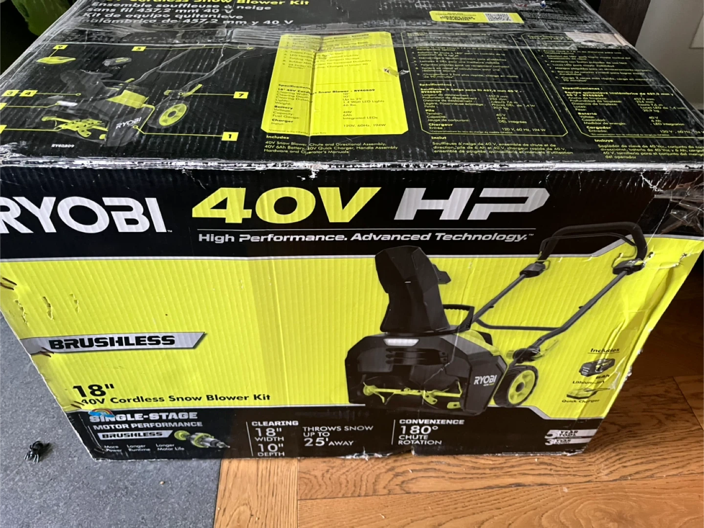 18Selling a Ryobi 40V HP 18" Cordless Snow Blower Kit. It features brushless motor performance for more power and longer motor life. It clears an 18" width and 10" depth and throws snow up to 25' away. The chute has 180° rotation for convenience. Includes a 40V 6Ah battery, Ryobi quick charger, handle assembly, hardware, and operator's manuals new in box