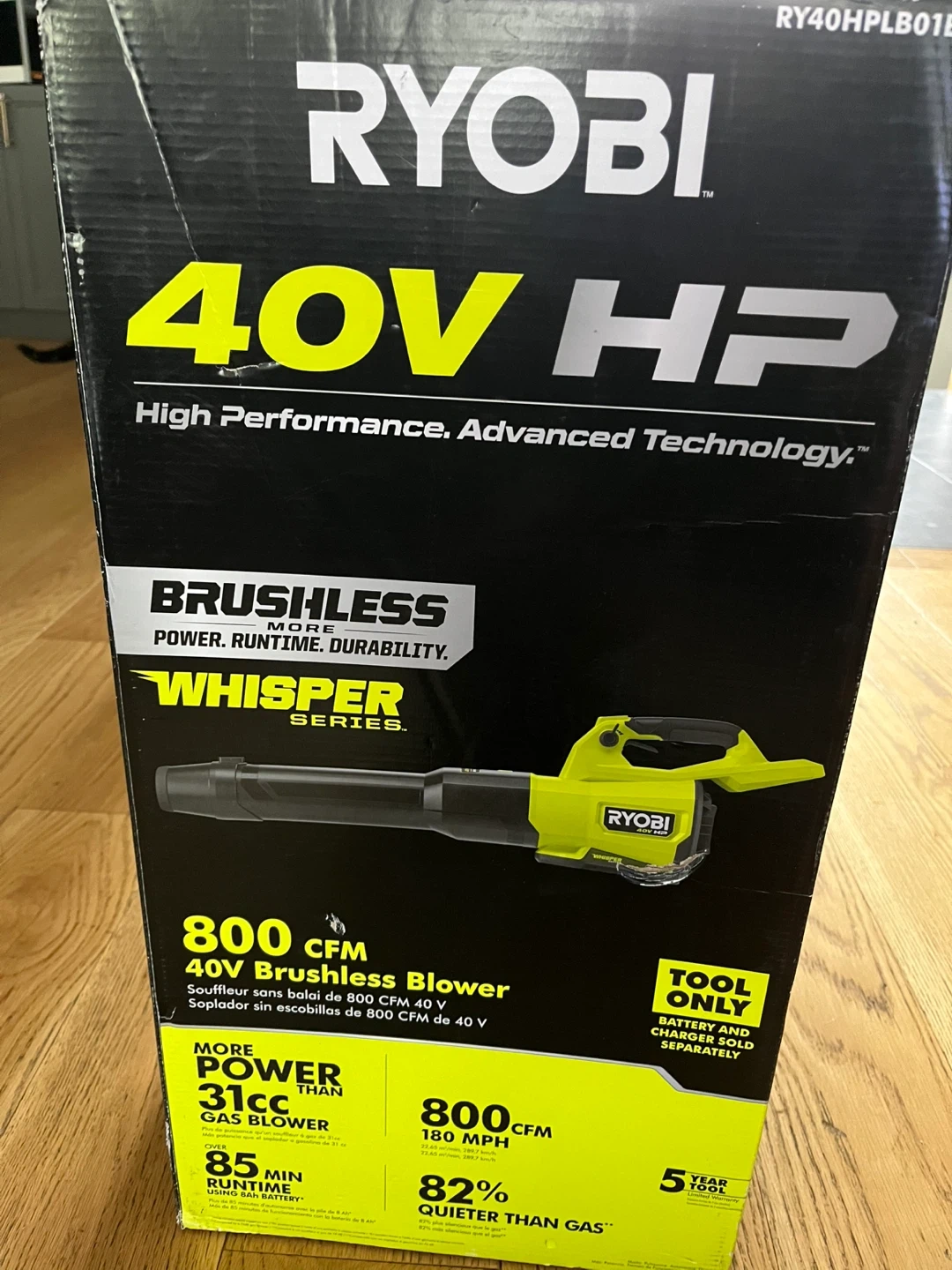 18Selling a Ryobi 40V HP Brushless Blower. It's a tool-only unit, meaning the battery and charger are sold separately. This blower features: - 800 CFM - More power than a 31cc gas blower - Up to 85 minutes of runtime using a battery - 82% quieter than gas models - Part of the Whisper Series New