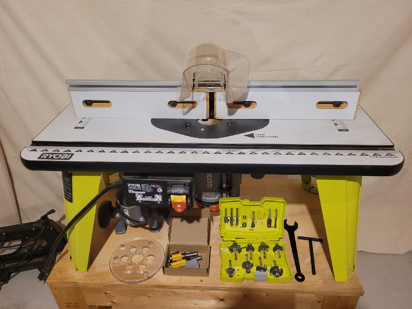 10Selling a Ryobi A25RT01 Router Table, complete with a Ridgid router. Gently used and in a mint condition. It includes various components and accessories, as shown in the pictures. Comes with a solid wooden table with shelf for storage and wheels for easy mobility. Great for woodworking projects!