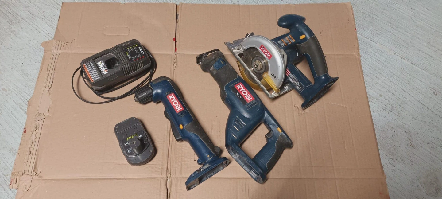 1: 5.5in circular saw 2: cordless saw 3: right angle drill Set of Ryobi cordless power tools, including a drill, a reciprocating saw, and a circular saw, all in blue with red logos. The set also features a battery charger and a detachable battery pack. Perfect for versatile DIY or professional cutting and drilling tasks! 🔧