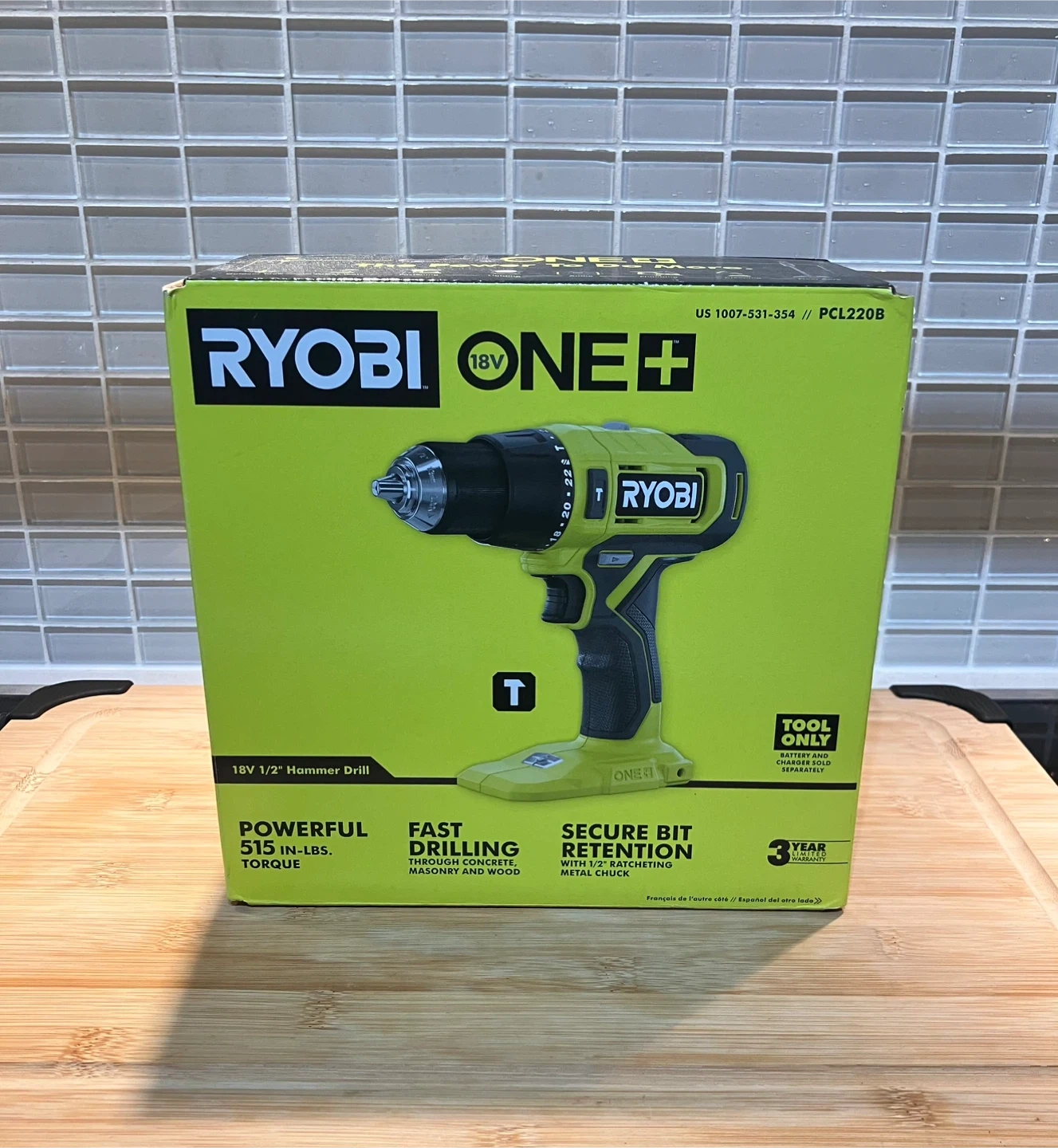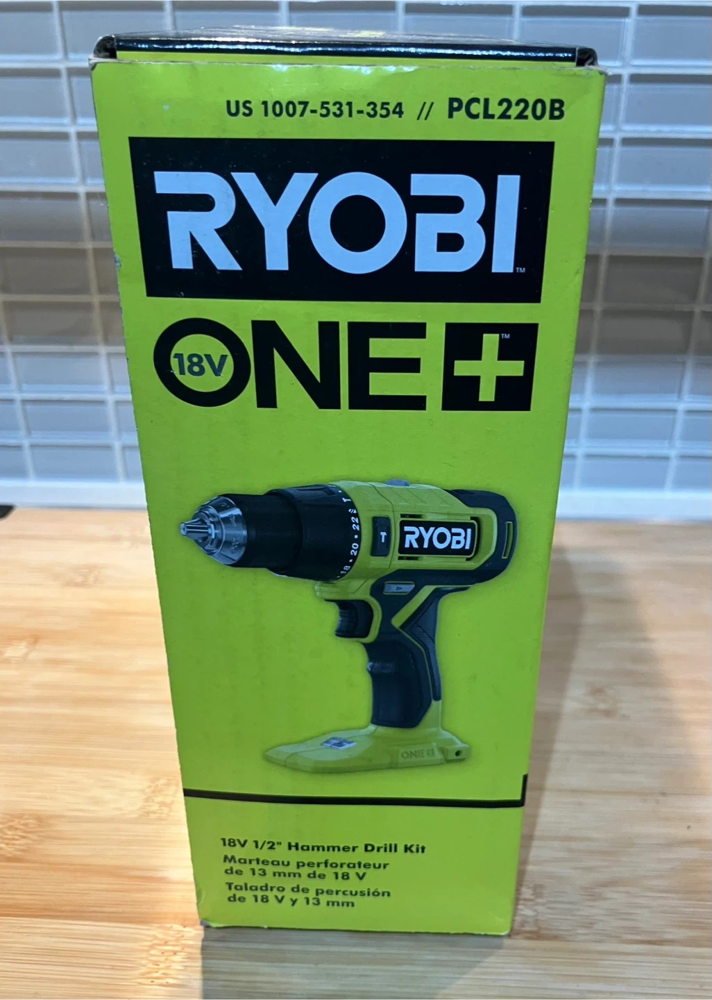 34Selling a brand new Ryobi ONE+ 18V 1/2" Hammer Drill Kit! It's still in the box and ready for your next project. This powerful drill has 515 in-lbs of torque for fast drilling through masonry and wood. It also features secure bit retention with a ratcheting metal chuck. Get the power to do more with Ryobi! Tool only. Does not include battery. Currently on sale at Home Depot for $108 plus $12.96 tax (Total: $120.96).