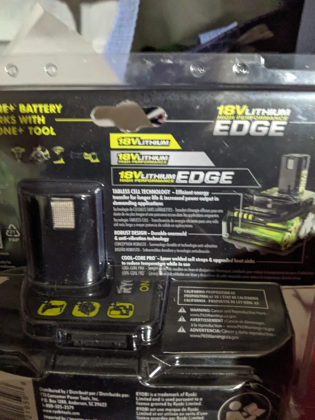 10Selling a brand new Ryobi ONE+ 18V Lithium High Performance Edge 4Ah battery. It works with any ONE+ tool, offering 2X more power and 4X longer runtime. The tabless cell technology provides efficient energy transfer, and it features robust design with anti-vibration technology. Runs cooler and lives longer!
