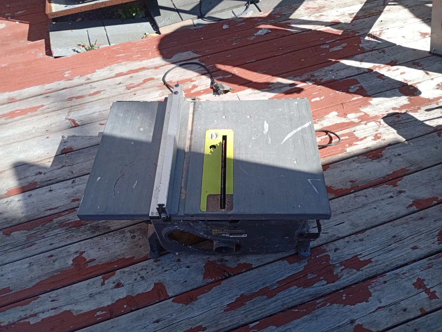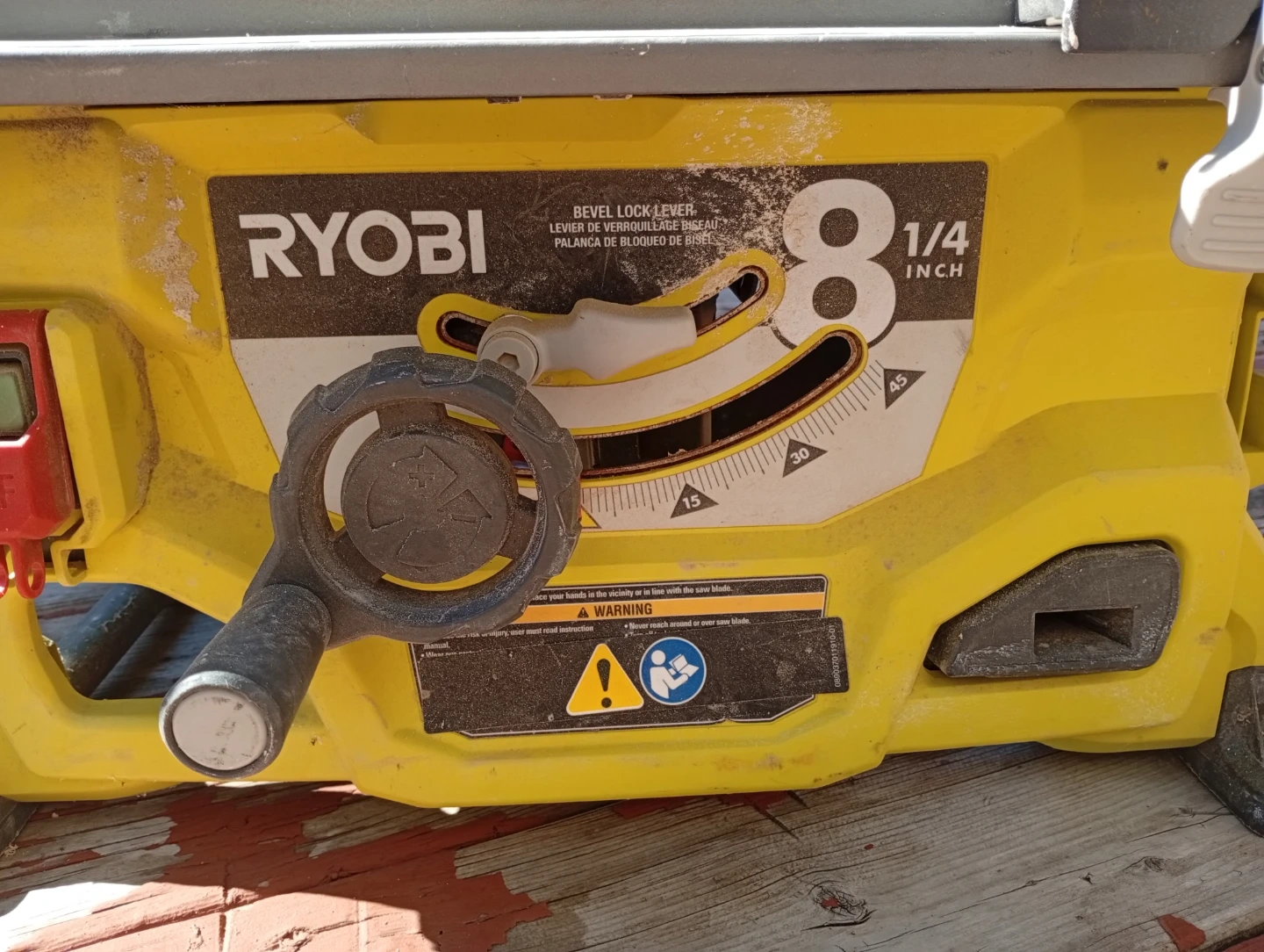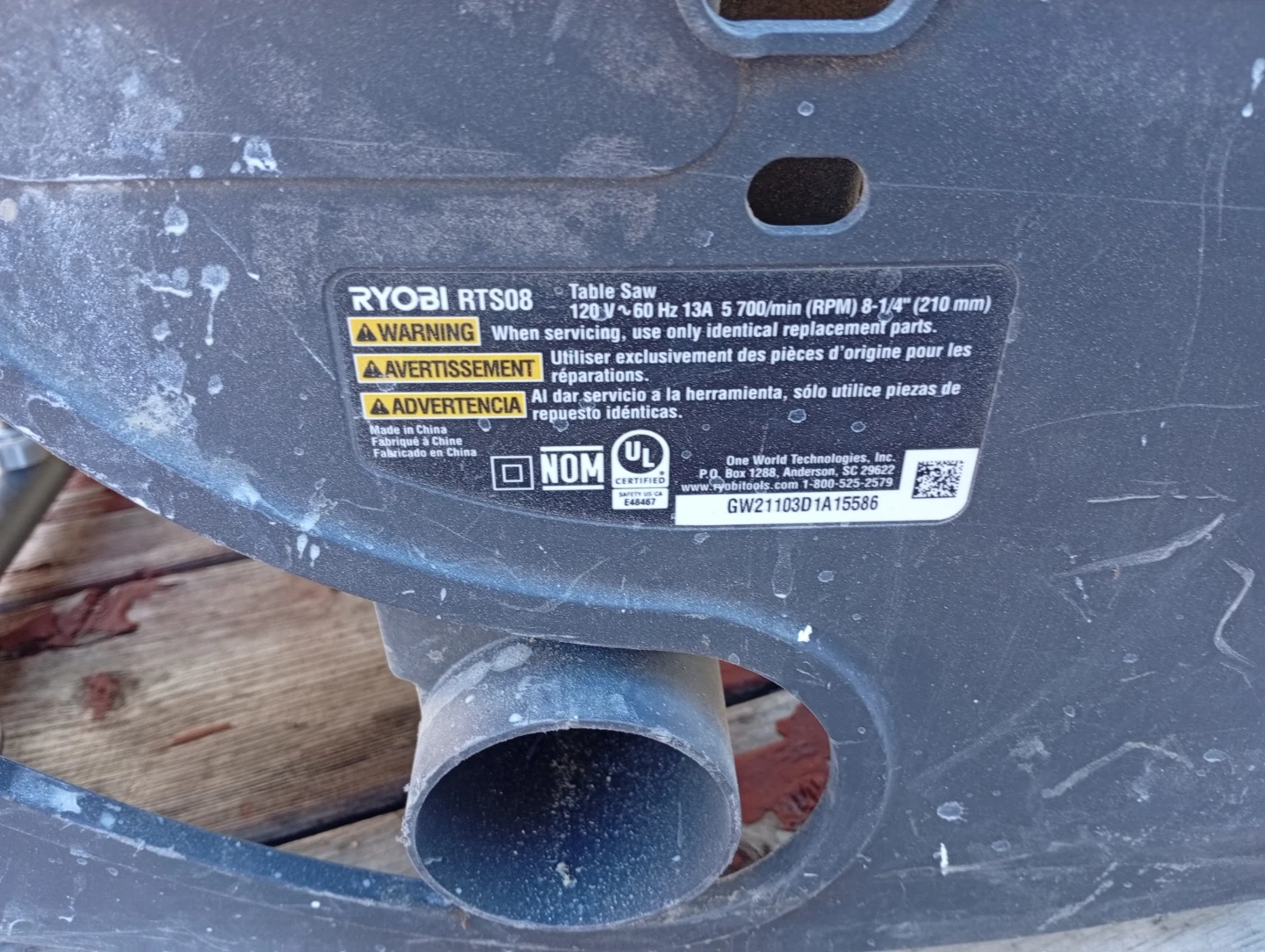 10Selling a Ryobi RTS08 table saw. It uses 120V and 60Hz 13A 5700/min (RPM). The blade is 8-1/4" (210 mm).