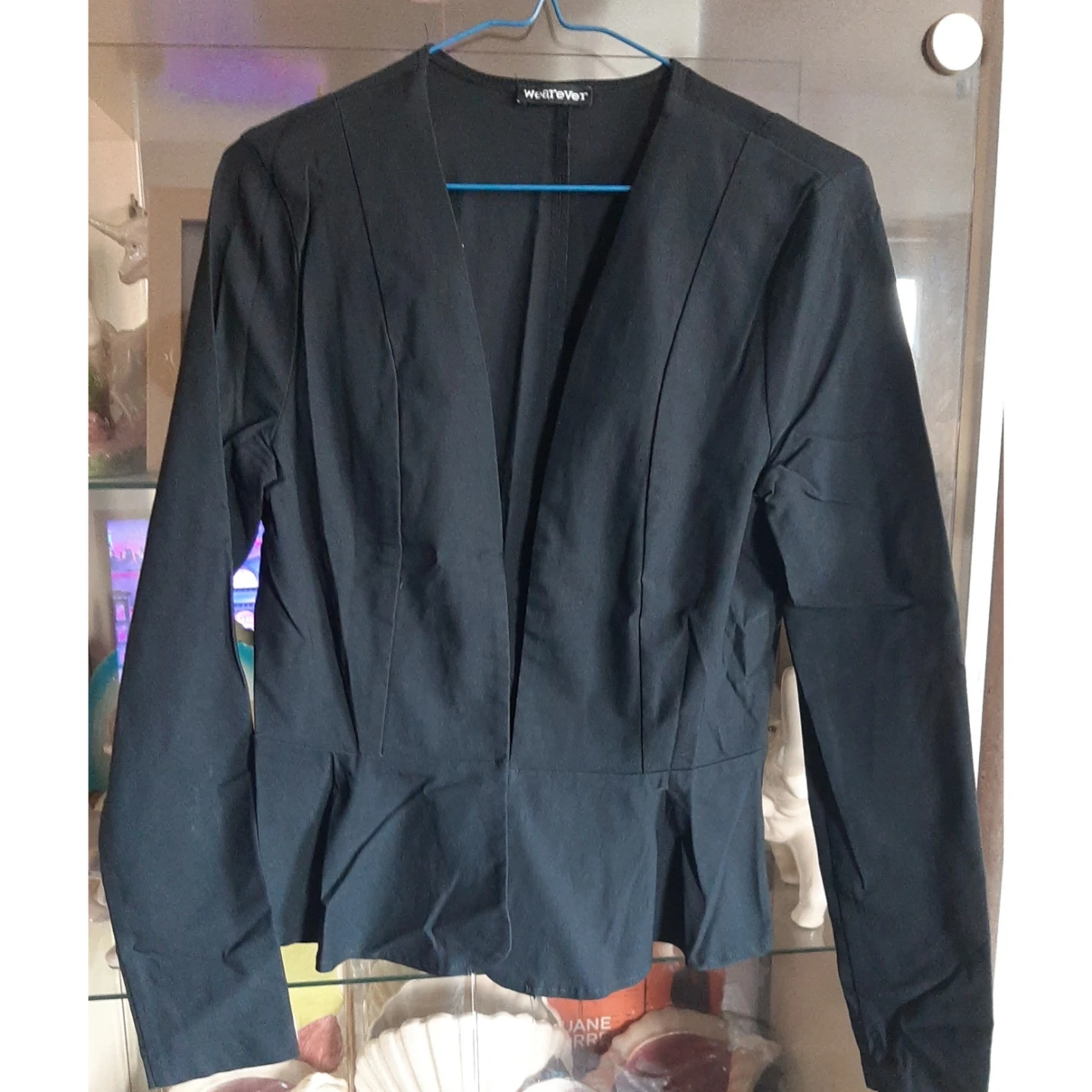 This is a stylish black blazer from WESTEVER. It features a V-neckline and long sleeves. The blazer is made from a fabric blend, perfect for a polished look.