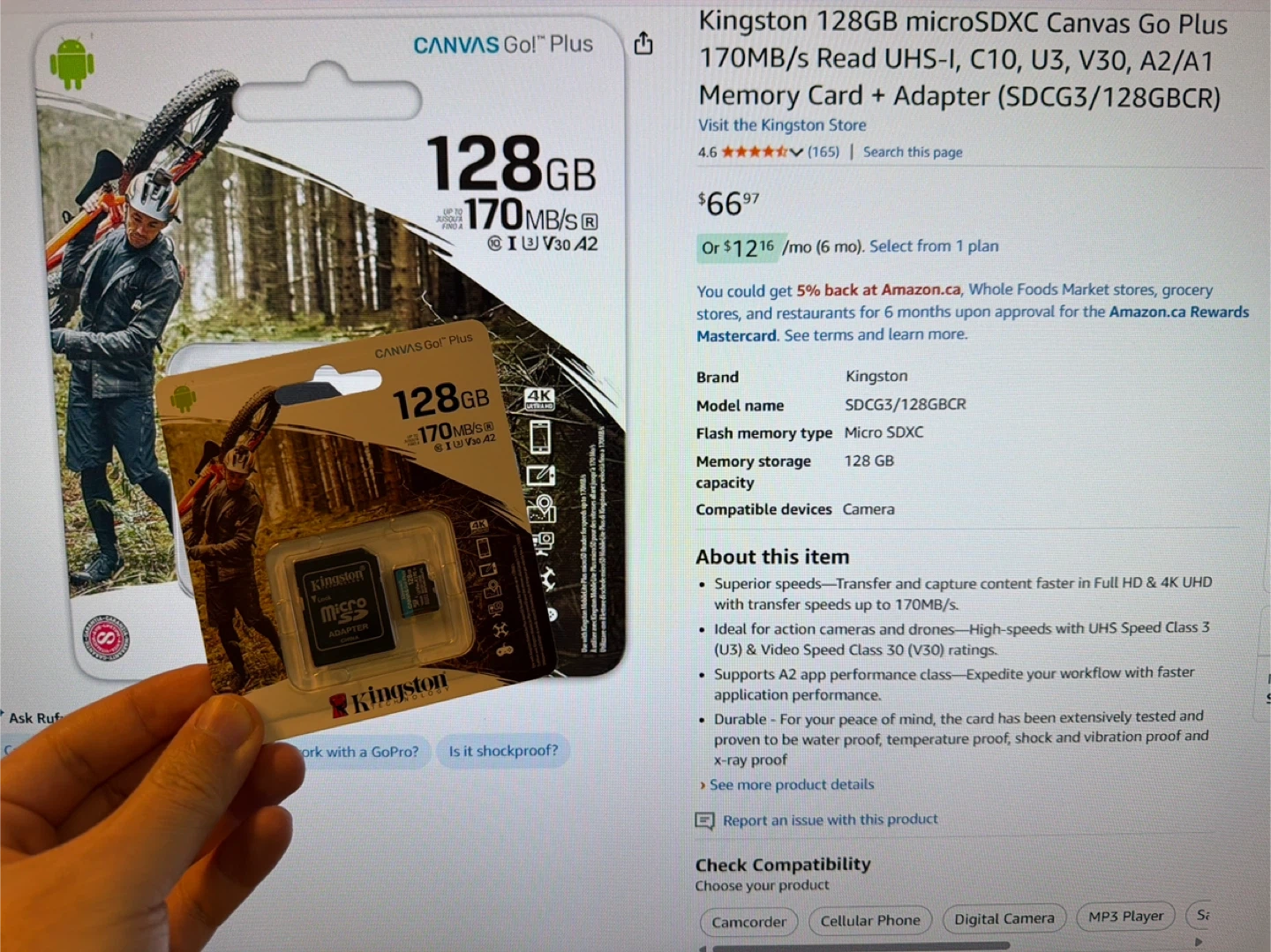 This all-new sealed Kingston 128GB microSDXC Canvas Go Plus memory card offers up to 170MB/s transfer speed. It's ideal for 4K action cameras and drones, supporting UHS Speed Class 3 and Video Speed Class 30 ratings. The card's durable design makes it water-proof, temperature-proof, shock-proof, and X-ray proof. Amazon price: 66+tax