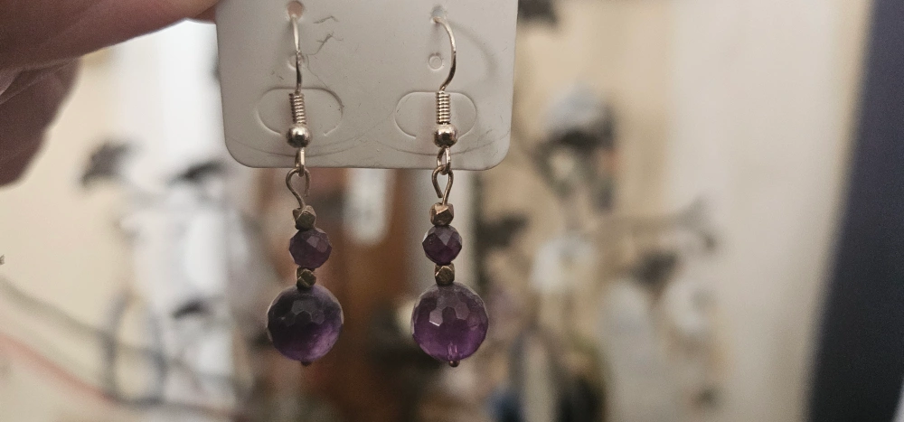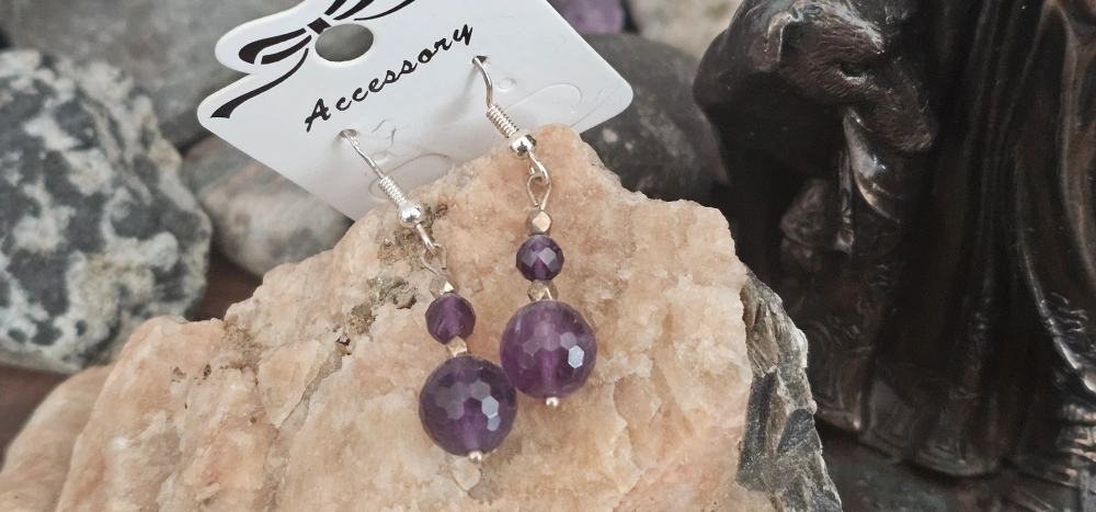 Amethyst gemstone dangle earrings. Sterling Silver hooks. Small silver beads accent the larger amethyst beads.