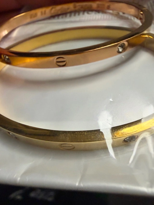 Selling a set of Cartier Love bracelet style bangles in gold stainless steel. These are brand new, never worn. Gold tone stainless steel (doesn’t tarnish easily). Screw design with embedded stones. Solid, structured feel (not flimsy). Comes as a set of 2. Perfect for stacking or adding a luxury look without the luxury price.