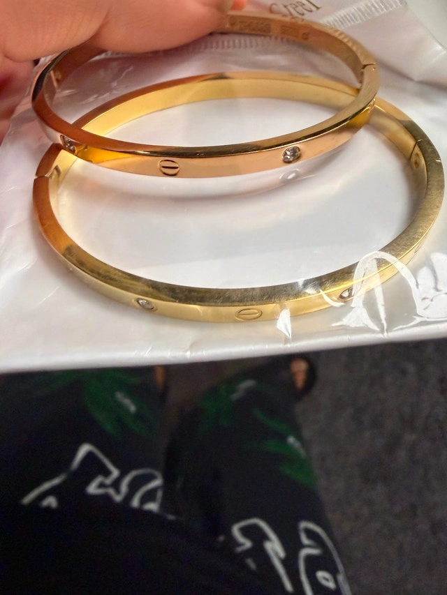 Selling a set of Cartier Love bracelet style bangles in gold stainless steel. These are brand new, never worn. Gold tone stainless steel (doesn’t tarnish easily). Screw design with embedded stones. Solid, structured feel (not flimsy). Comes as a set of 2. Perfect for stacking or adding a luxury look without the luxury price.