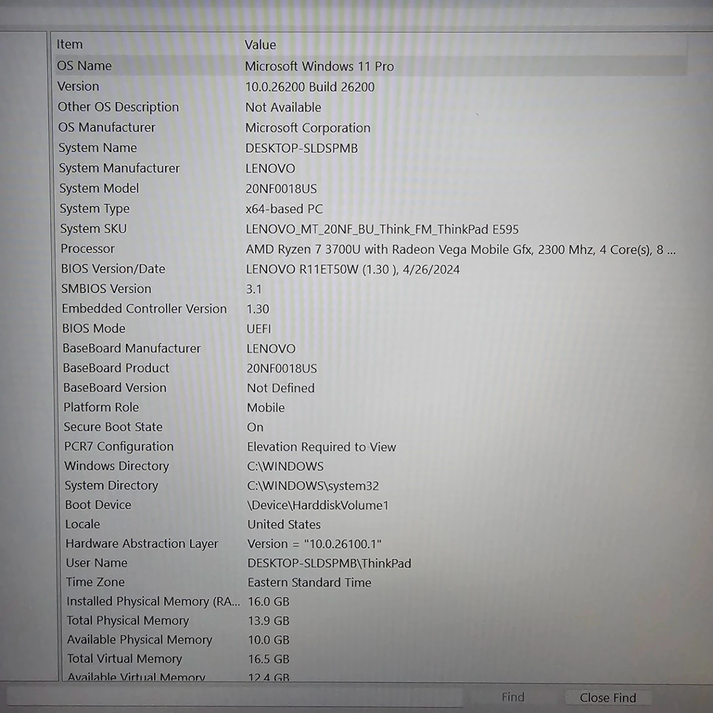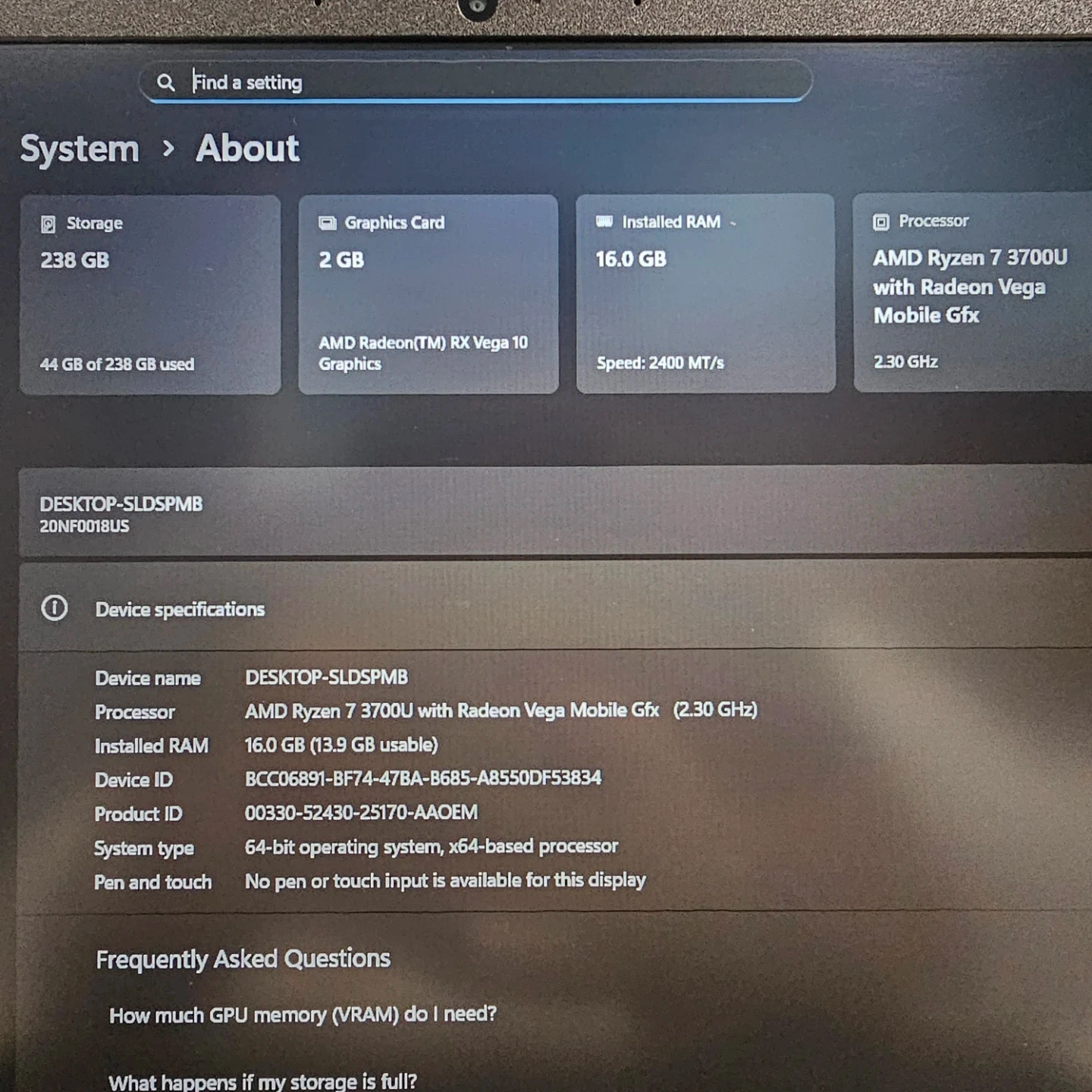 This Lenovo ThinkPad laptop features an AMD Ryzen 7 3700U processor with Radeon Vega Mobile Gfx. It comes with 16.0 GB of RAM and a 238 GB SSD. The display resolution is 1920 x 1080. Includes the power adapter.