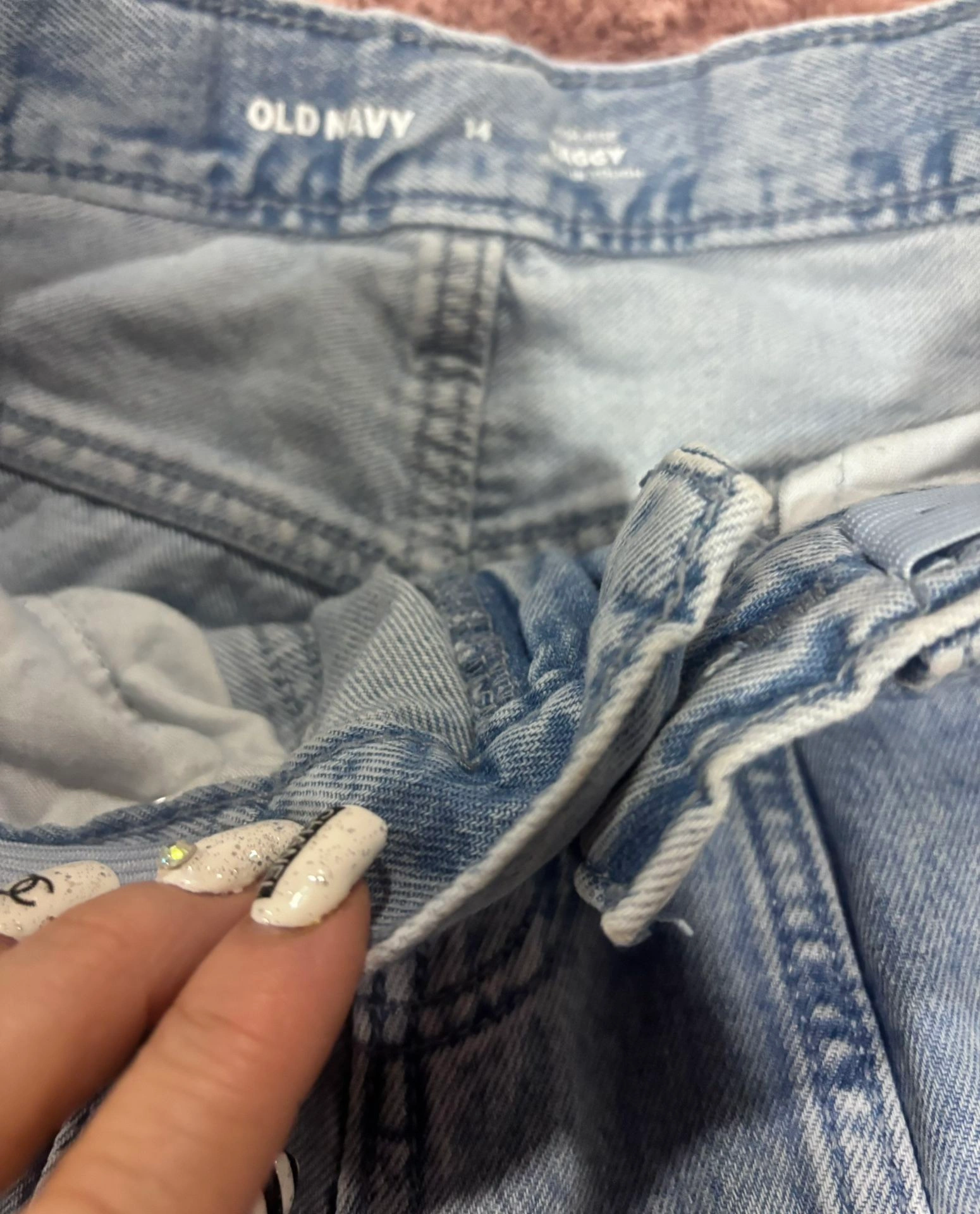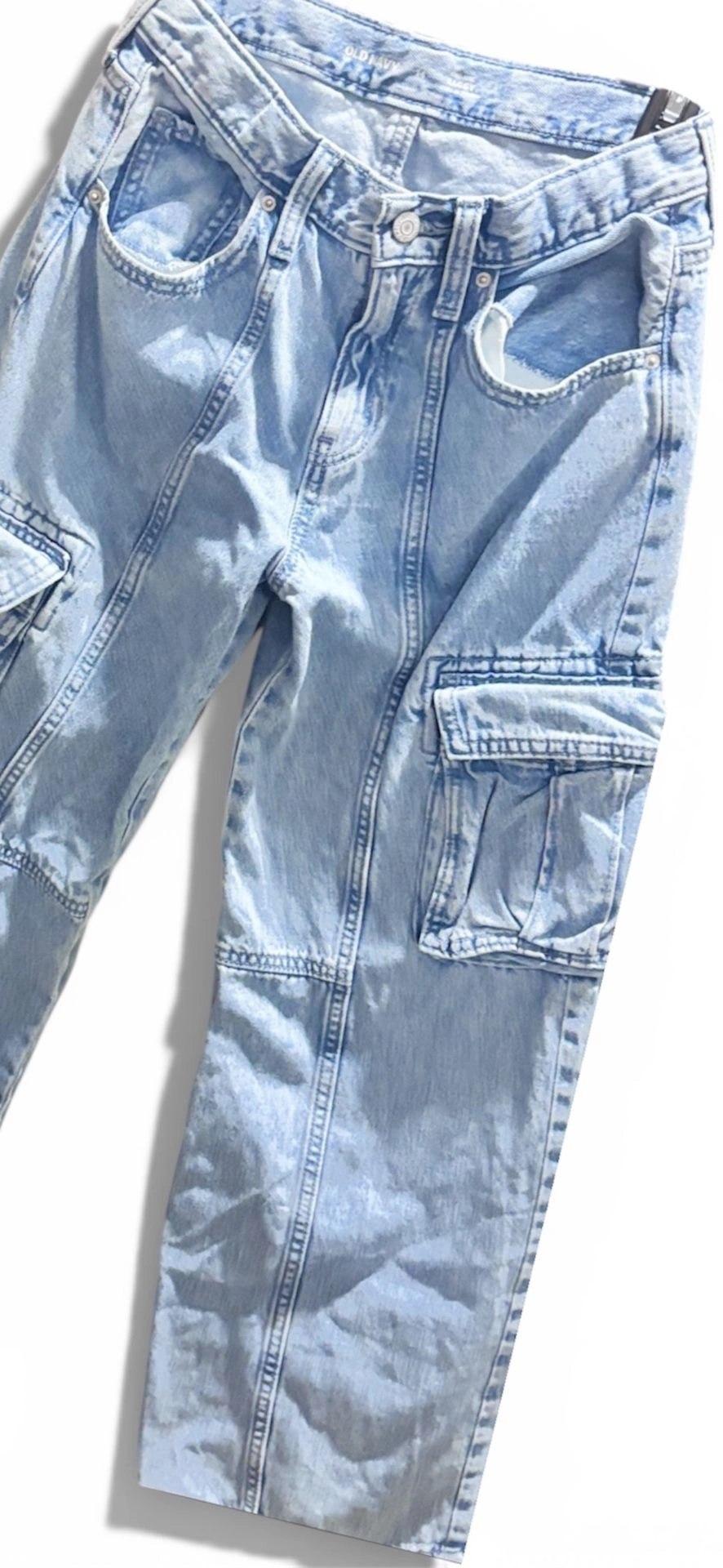 Great condition pre-owned Old Navy high-rise wide leg cargo jeans in a classic light wash denim. These jeans feature a baggy, relaxed fit with utility cargo pockets, giving them a trendy Y2K / street-style look while remaining comfortable and durable. Lightly worn and well cared for with no rips, holes, or stains noted. Fabric remains sturdy and structured — true to Old Navy’s “built tough” denim feel. Brand: Old Navy. Size: 14 Junior or women. Color: Light wash denim. High-rise waist. Wide leg / baggy fit. Cargo pocket detailing on legs. Button and zip closure. Durable denim construction. Measurements (laid flat): Waist: 14 inches across. Inseam: 34 inches. Rise: High-rise. Please compare measurements to a similar pair you own for best fit. Perfect for casual wear, street style outfits, everyday comfort, or pairing with sneakers, boots, or crop tops. A versatile on-trend denim style that’s easy to dress up or down.