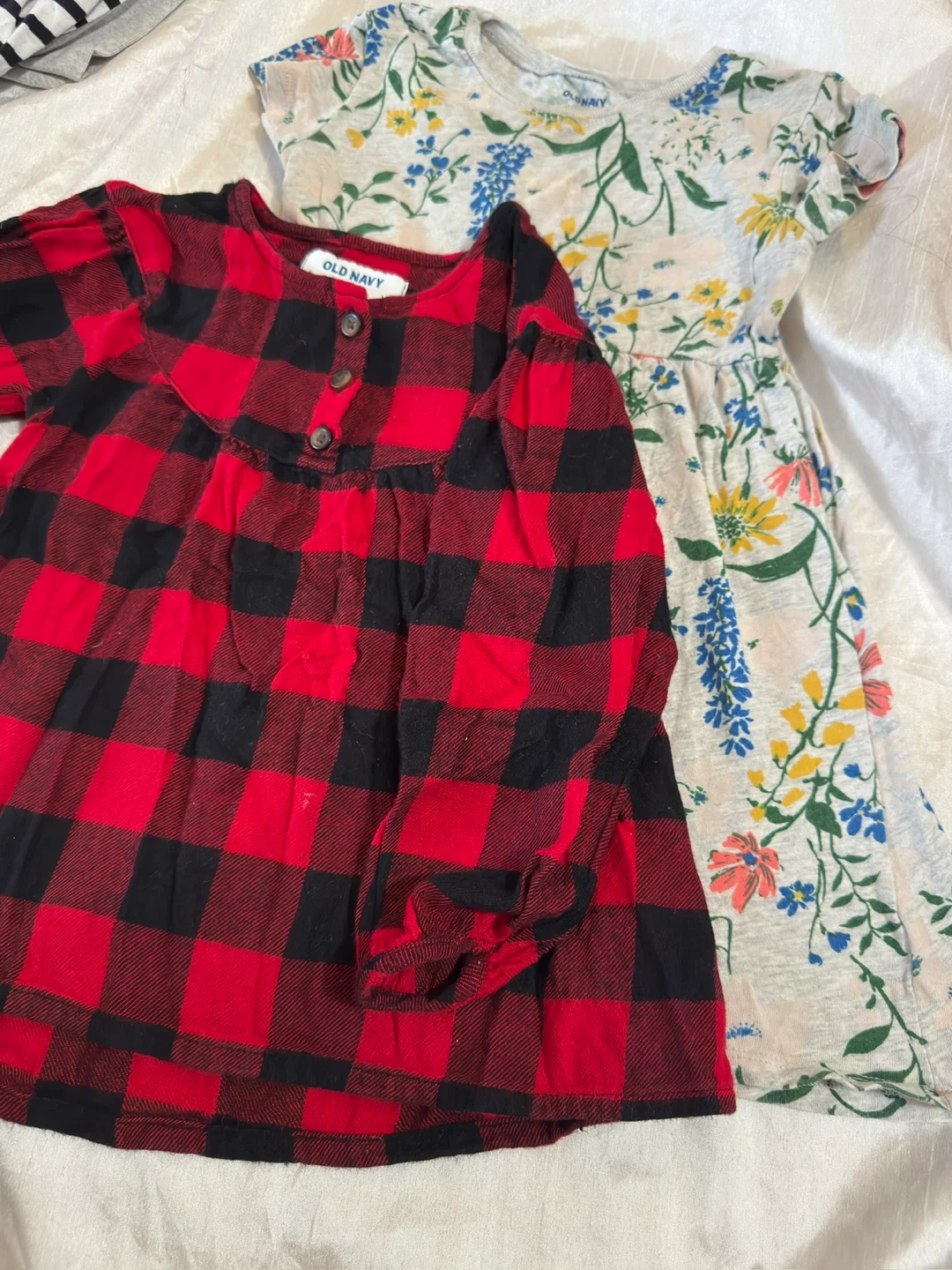 This Old Navy dress features a classic red and black buffalo plaid pattern. It's a size 3T with a button-up detail at the neckline and long sleeves. It's made of soft material, perfect for everyday wear.