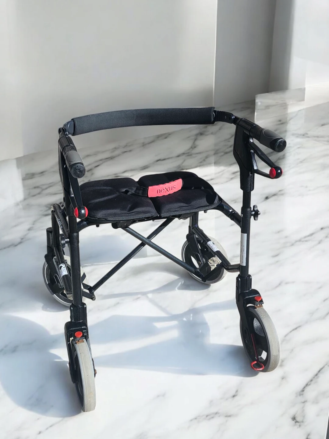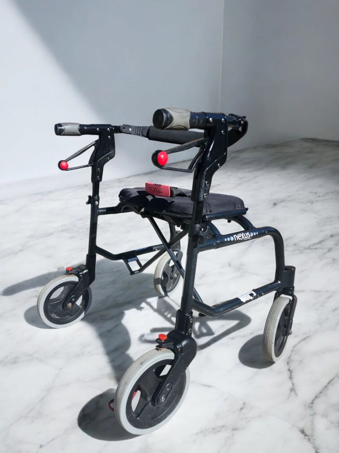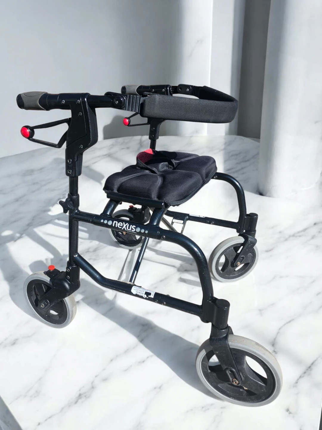 This black Nexus walker provides support and a place to rest. It features four wheels for easy manoeuvring and a padded seat. It's suitable for individuals needing assistance with mobility.