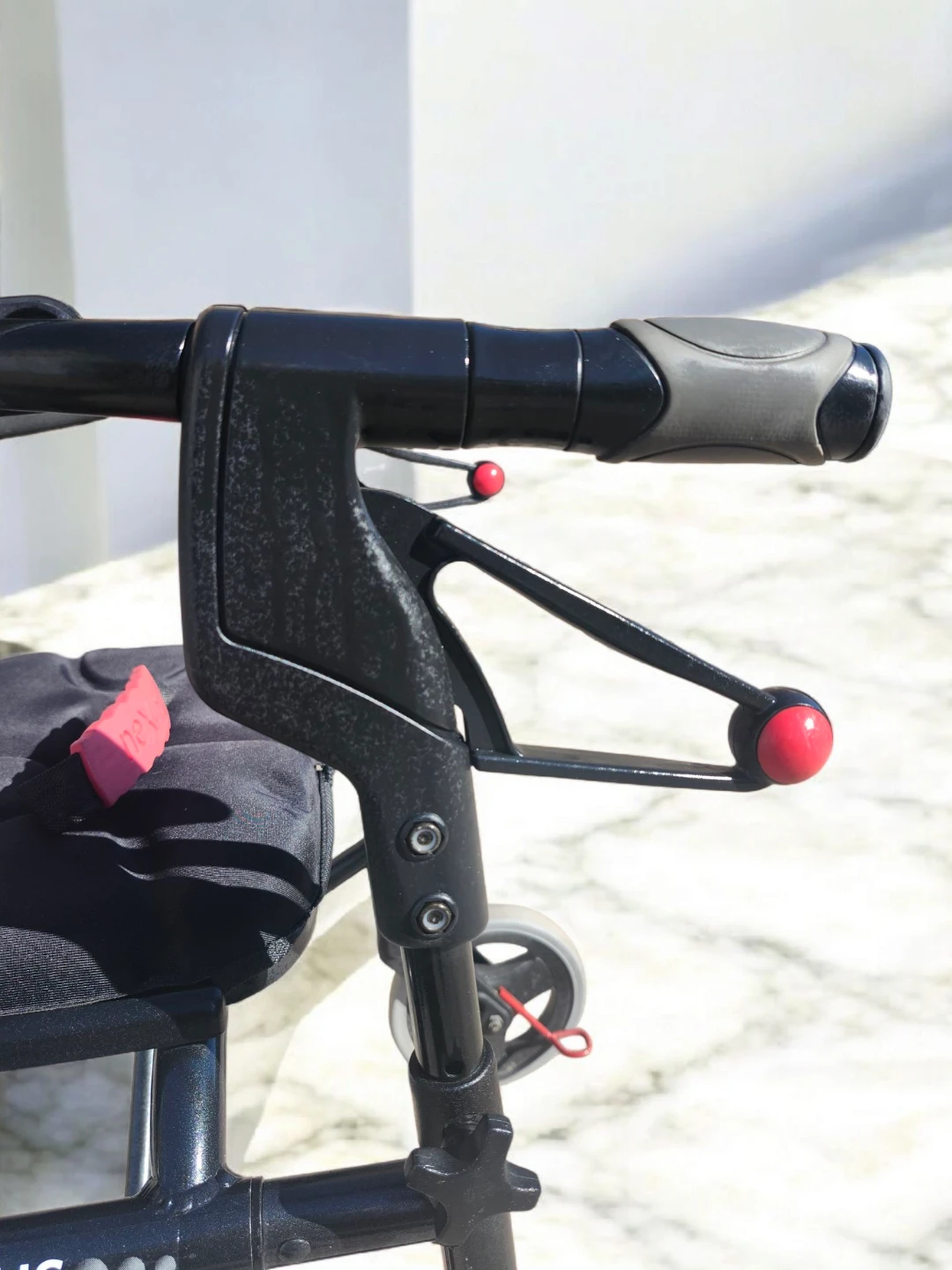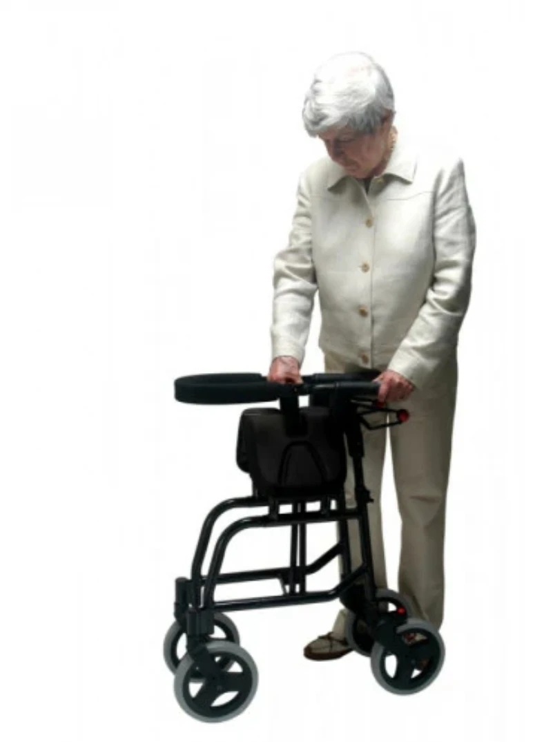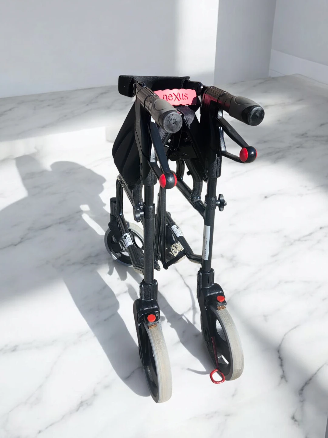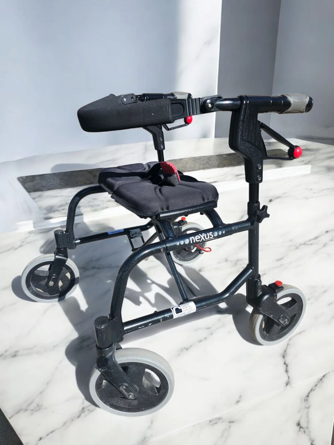 This black Nexus walker provides support and a place to rest. It features four wheels for easy manoeuvring and a padded seat. It's suitable for individuals needing assistance with mobility.