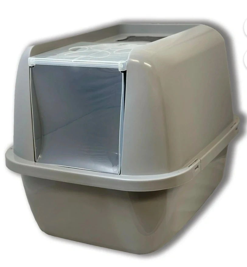 This is a Plastic jumbo enclosed cat litter box. It's grey in colour and features a hooded design with a swinging door. The enclosed nature helps contain litter scatter and odours.