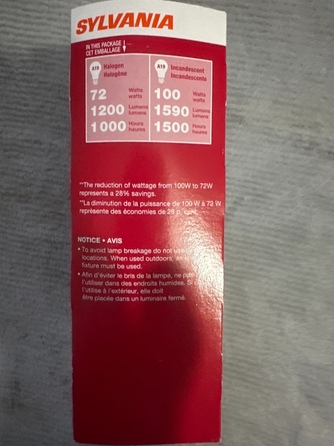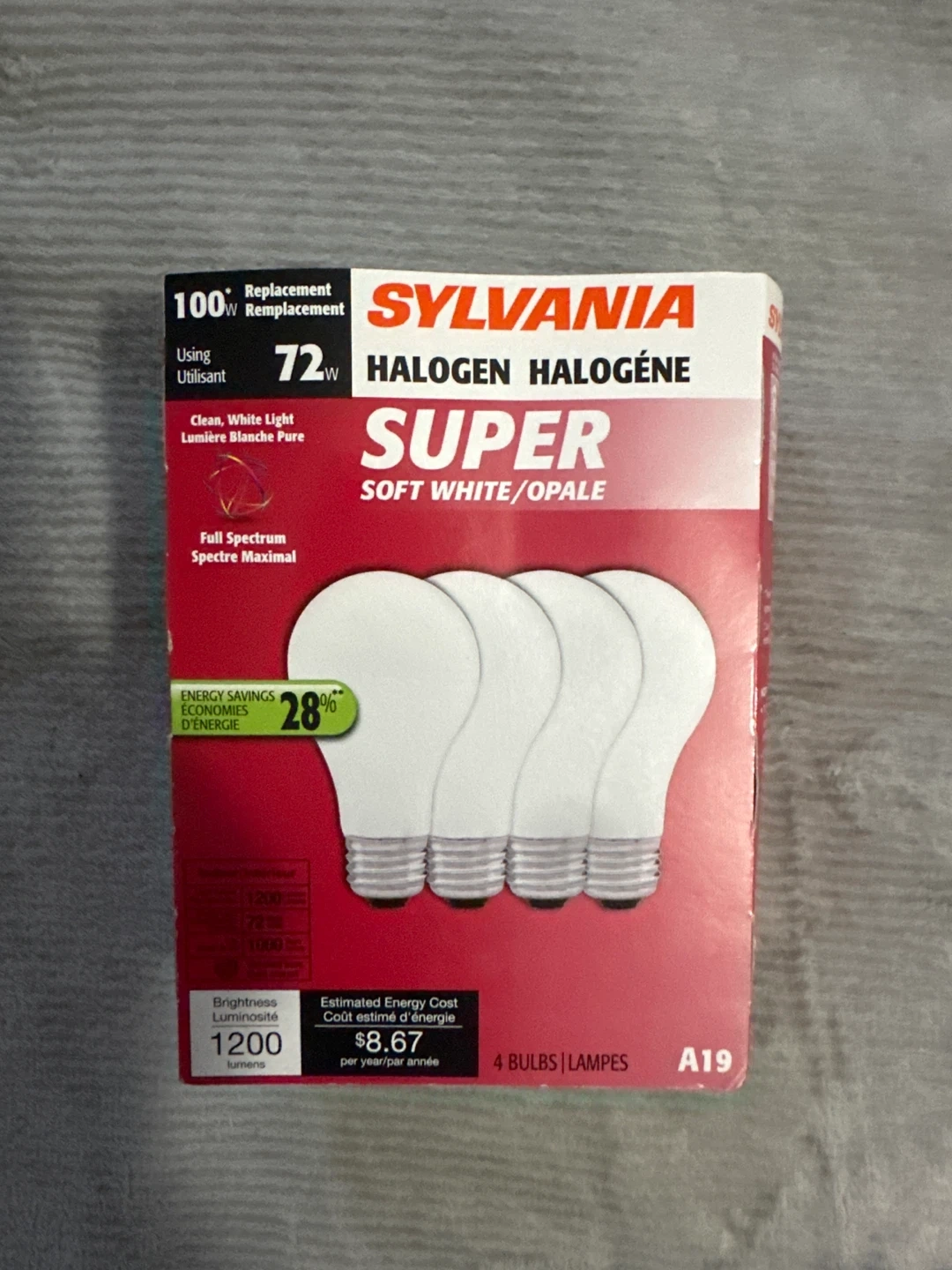 These Sylvania Super Soft White halogen bulbs offer 1200 lumens of clean, bright light. They are a 72W replacement for 100W bulbs, providing 28% energy savings. Each bulb is rated for 1500 hours of use. This pack contains 4 A19 bulbs.