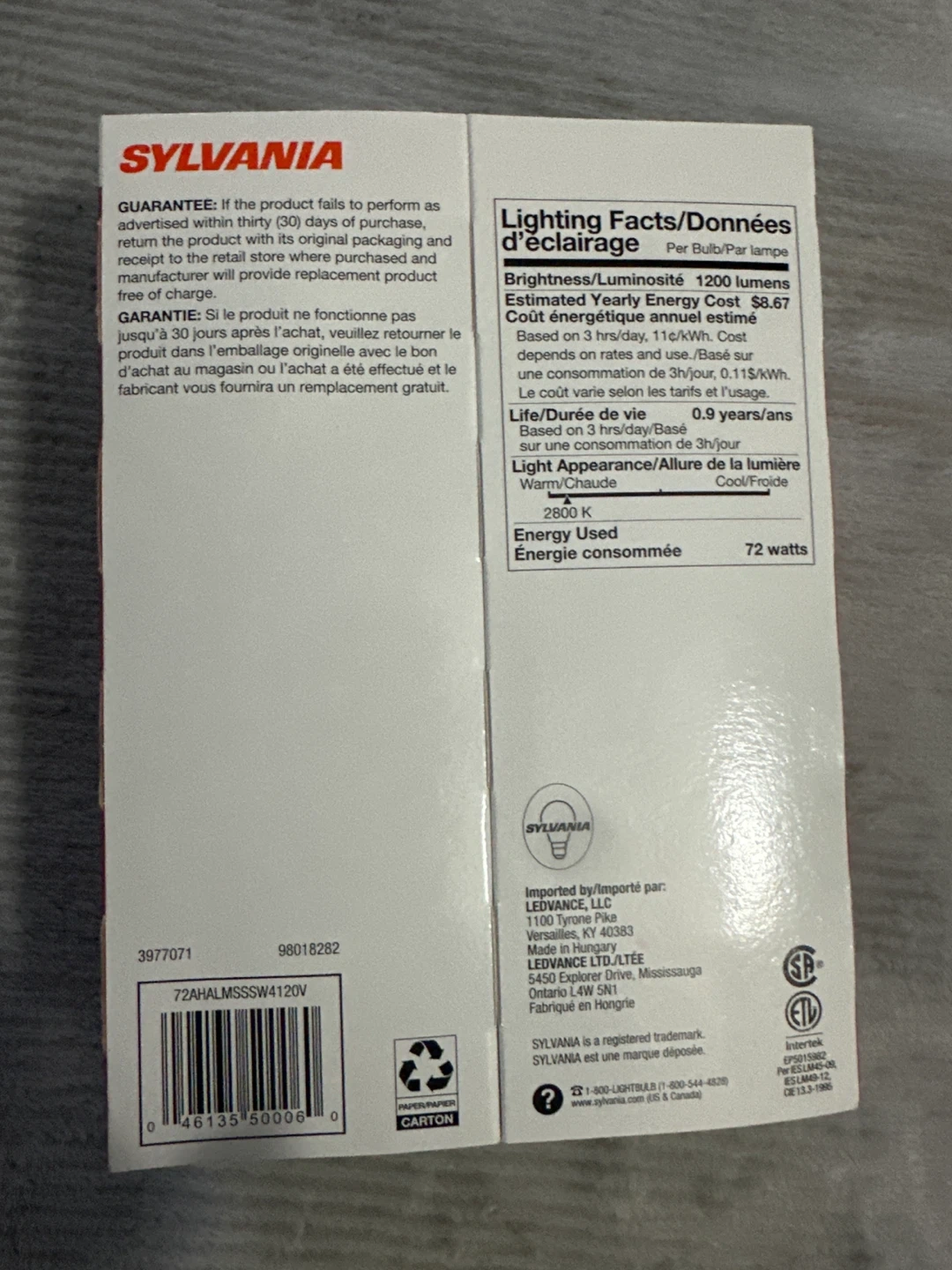 These Sylvania Super Soft White halogen bulbs offer 1200 lumens of clean, bright light. They are a 72W replacement for 100W bulbs, providing 28% energy savings. Each bulb is rated for 1500 hours of use. This pack contains 4 A19 bulbs.