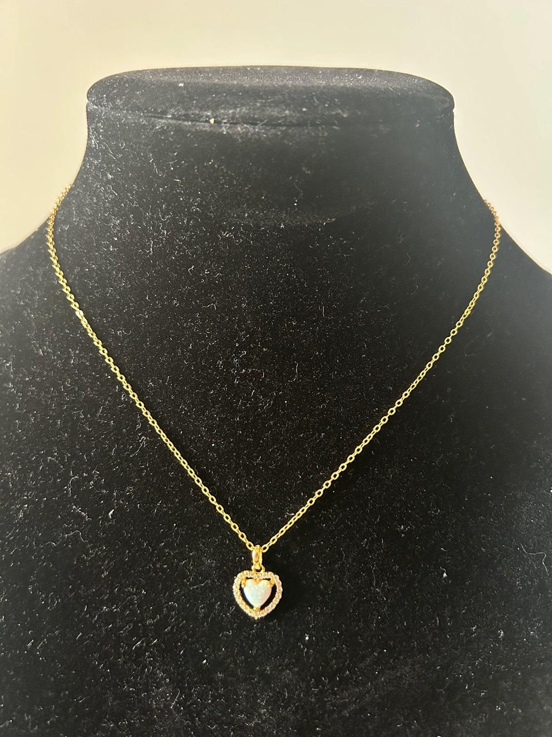 Gold chain necklace with a heart-shaped pendant featuring a white opal surrounded by smaller clear stones.