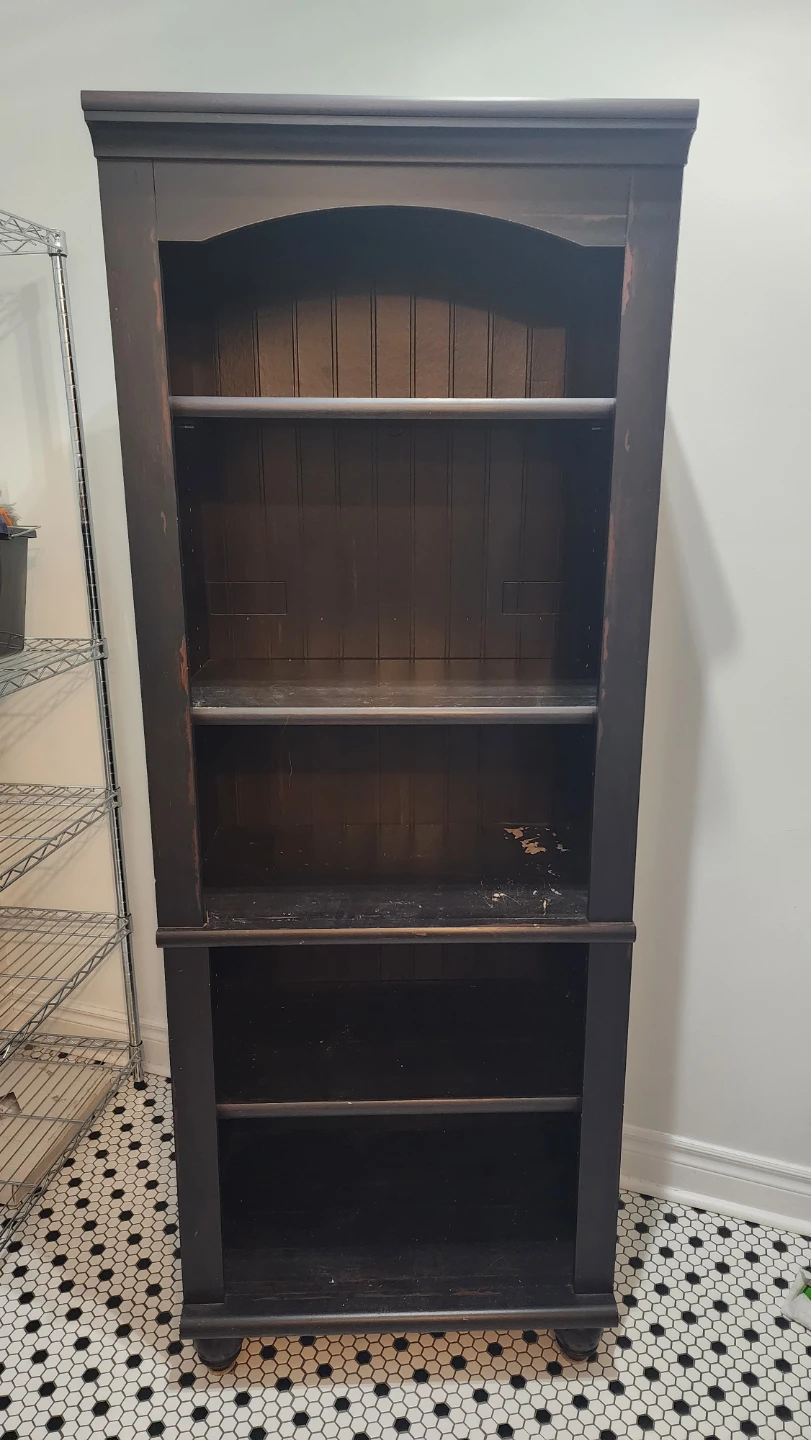 This is a dark brown wooden bookshelf. It features four shelves with a distressed finish on the edges. It's a great piece for organizing books or display items!