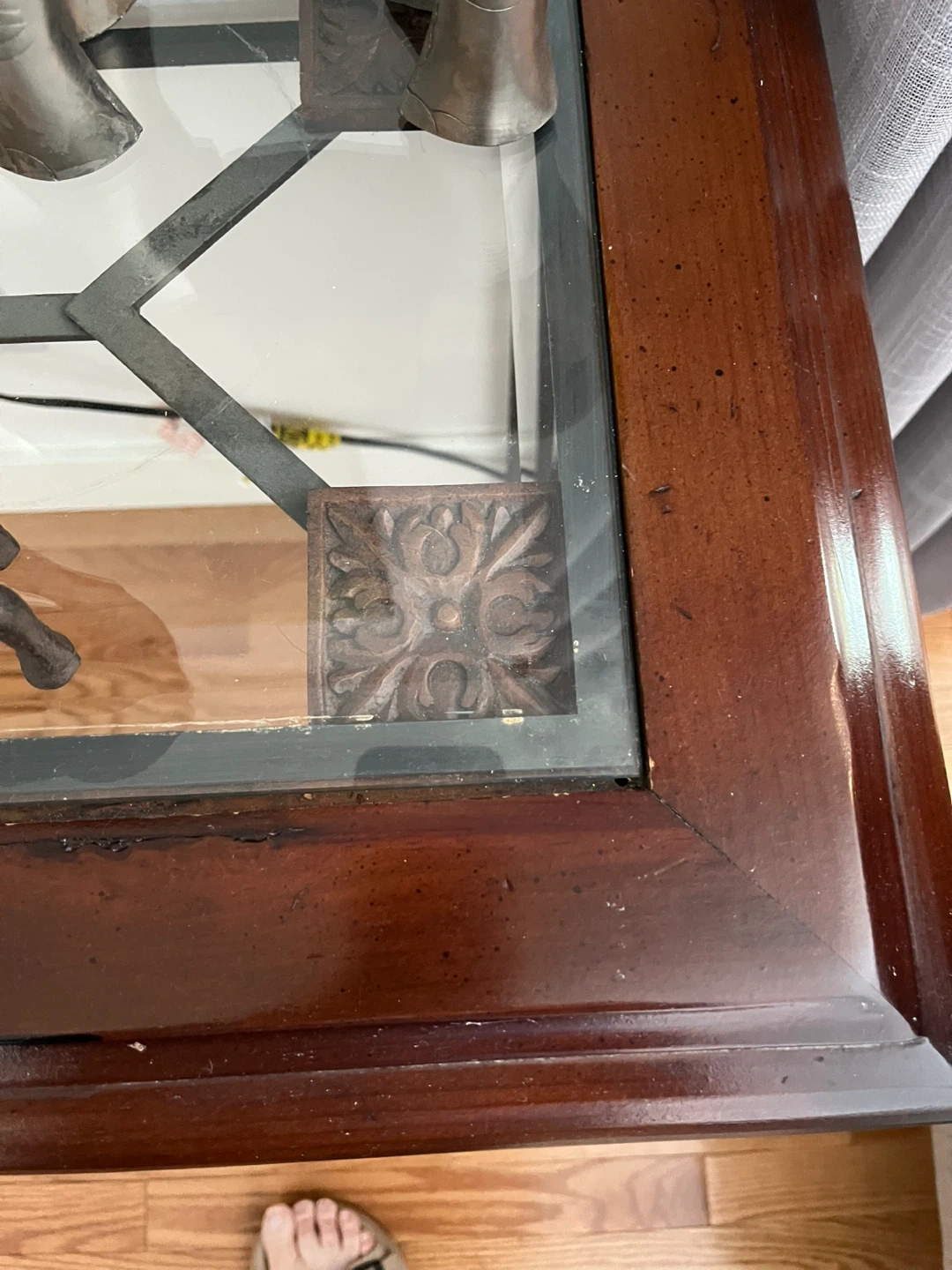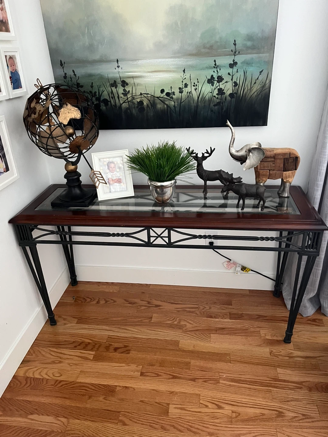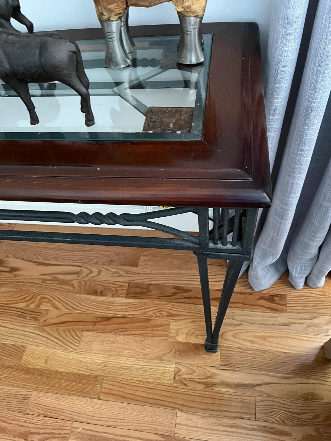 This console table features a rich wood top and a metal frame with intricate details. It has a glass top, perfect for displaying decor. The wood finish is a deep, warm tone.