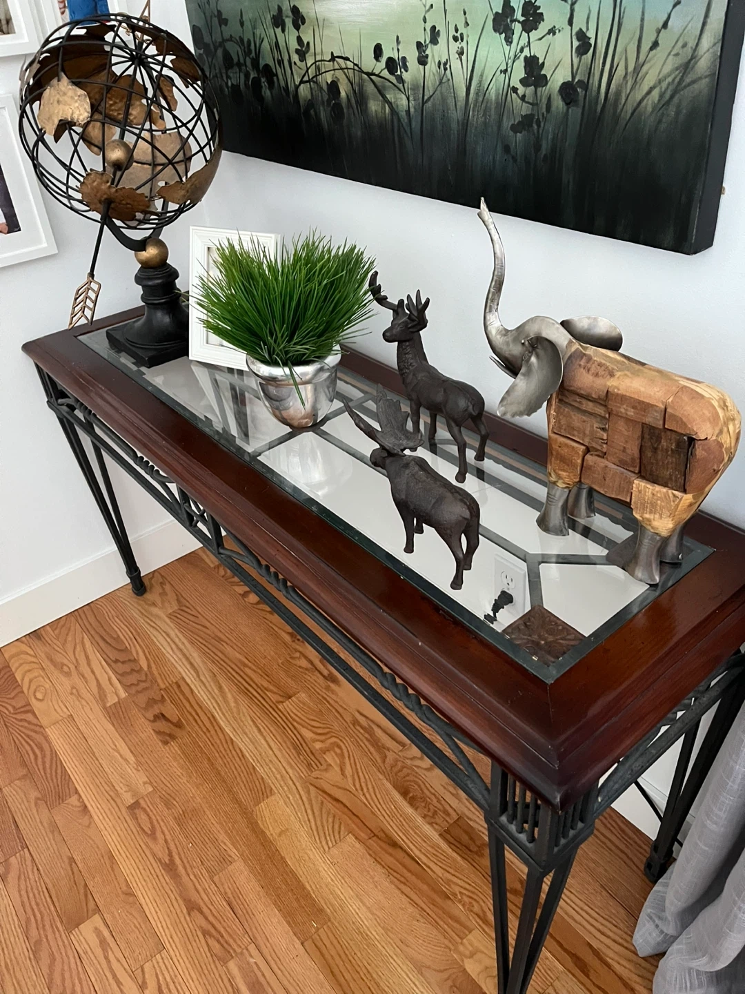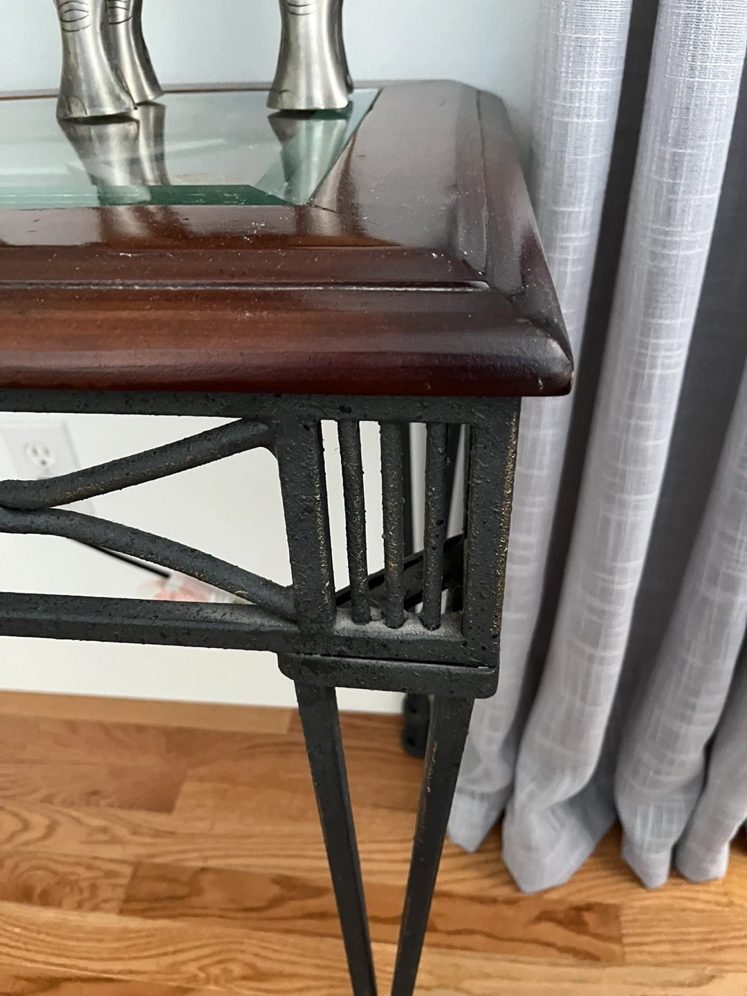 This console table features a rich wood top and a metal frame with intricate details. It has a glass top, perfect for displaying decor. The wood finish is a deep, warm tone.
