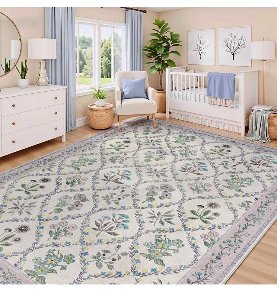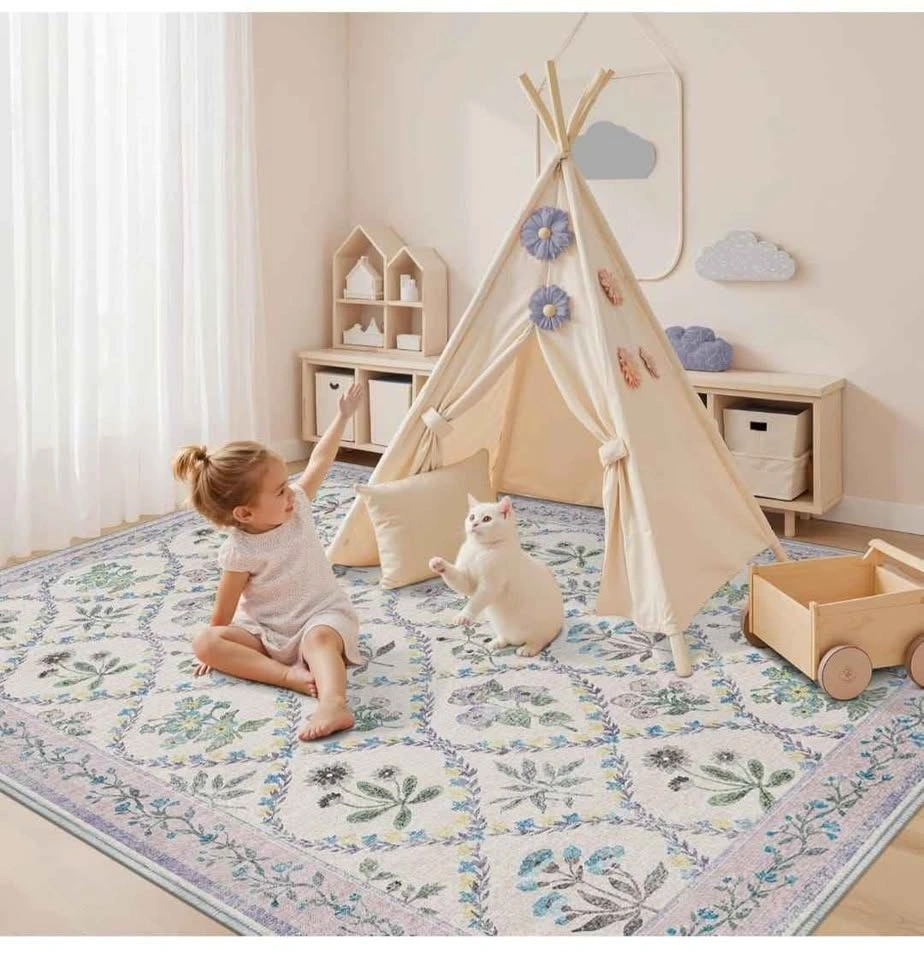 Brand new 8x10 washable area rug. Perfect for living room, bedroom, dining room, kitchen, office, or nursery. Features a boho floral vintage design in purple and grey. Low pile, soft, thin, and non-slip.