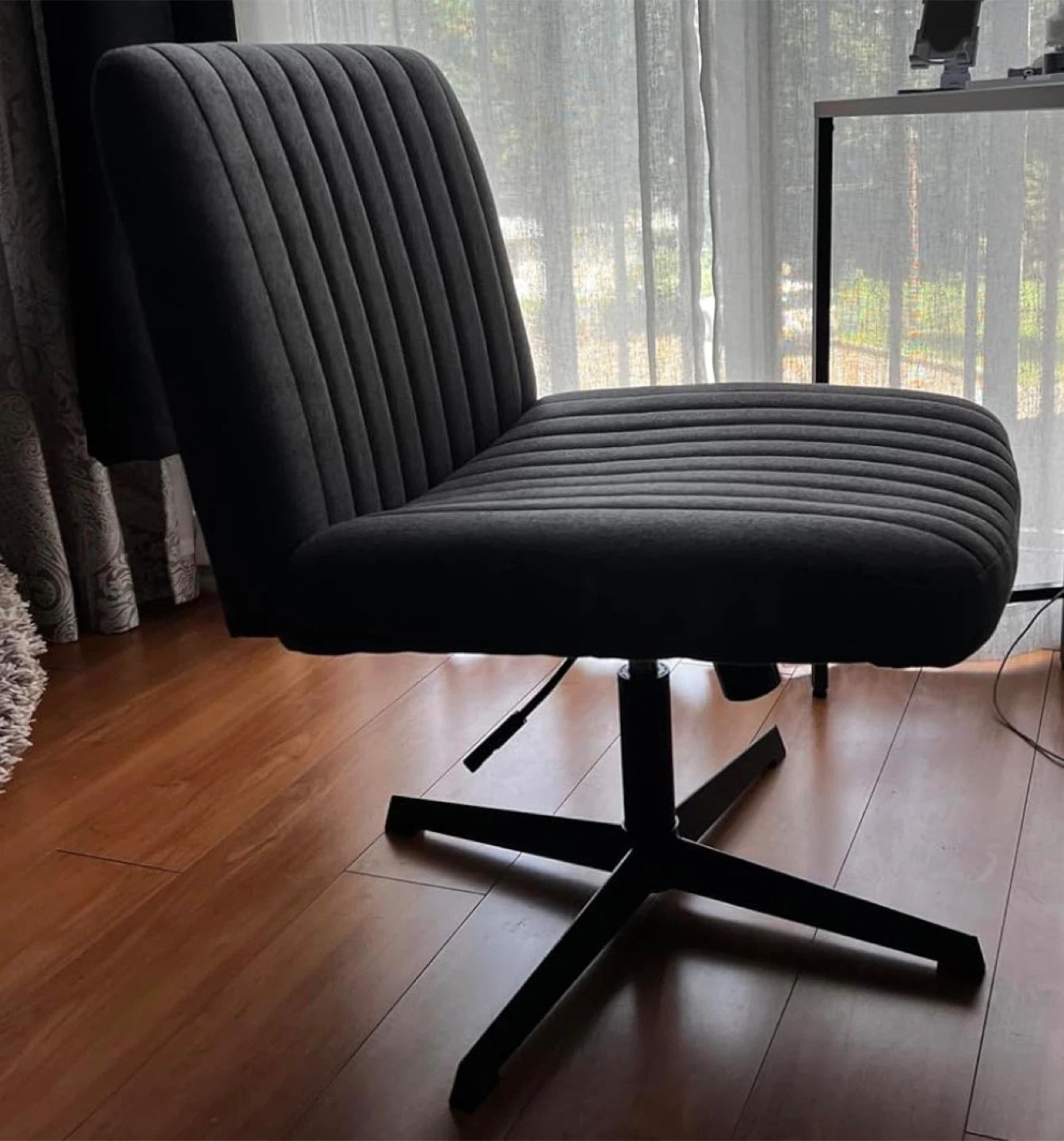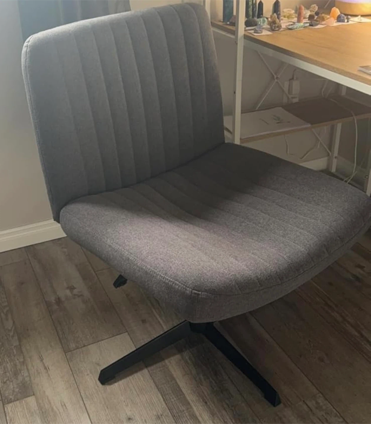 This is a stylish grey armless accent chair. It features a ribbed design on the back and seat, and it's upholstered in a soft fabric. The chair has a swivel base with five legs for stability.