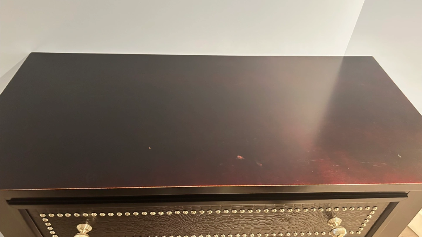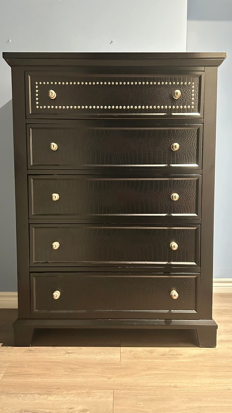 Here's a black 5-drawer dresser. It has a unique textured finish on the drawer fronts and decorative nailhead trim. It's a stylish piece for any bedroom!