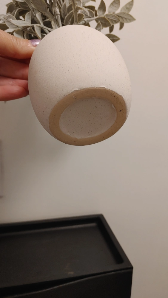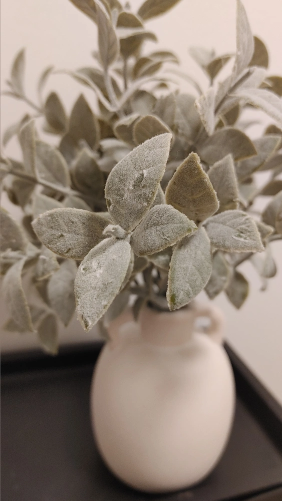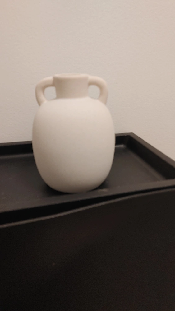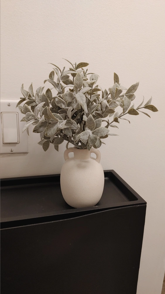 This decorative vase features a textured, light cream finish and two small handles. It comes with faux greenery to add a touch of nature to your space. Ceramic material. Small size.