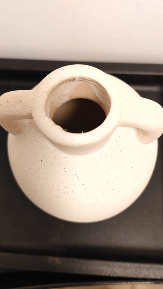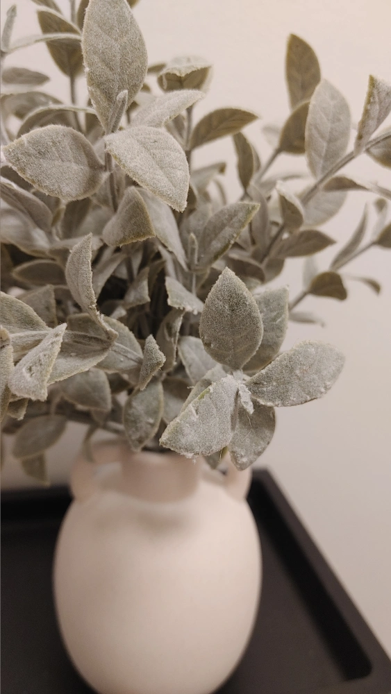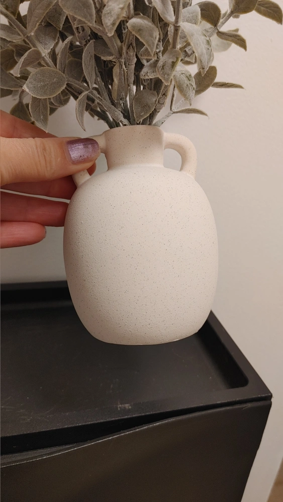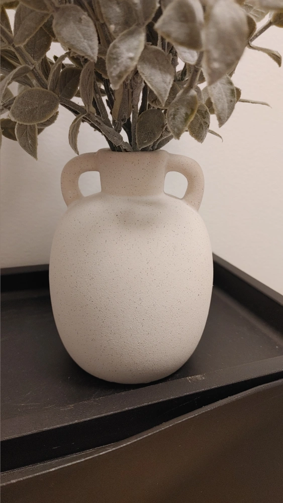 This decorative vase features a textured, light cream finish and two small handles. It comes with faux greenery to add a touch of nature to your space. Ceramic material. Small size.