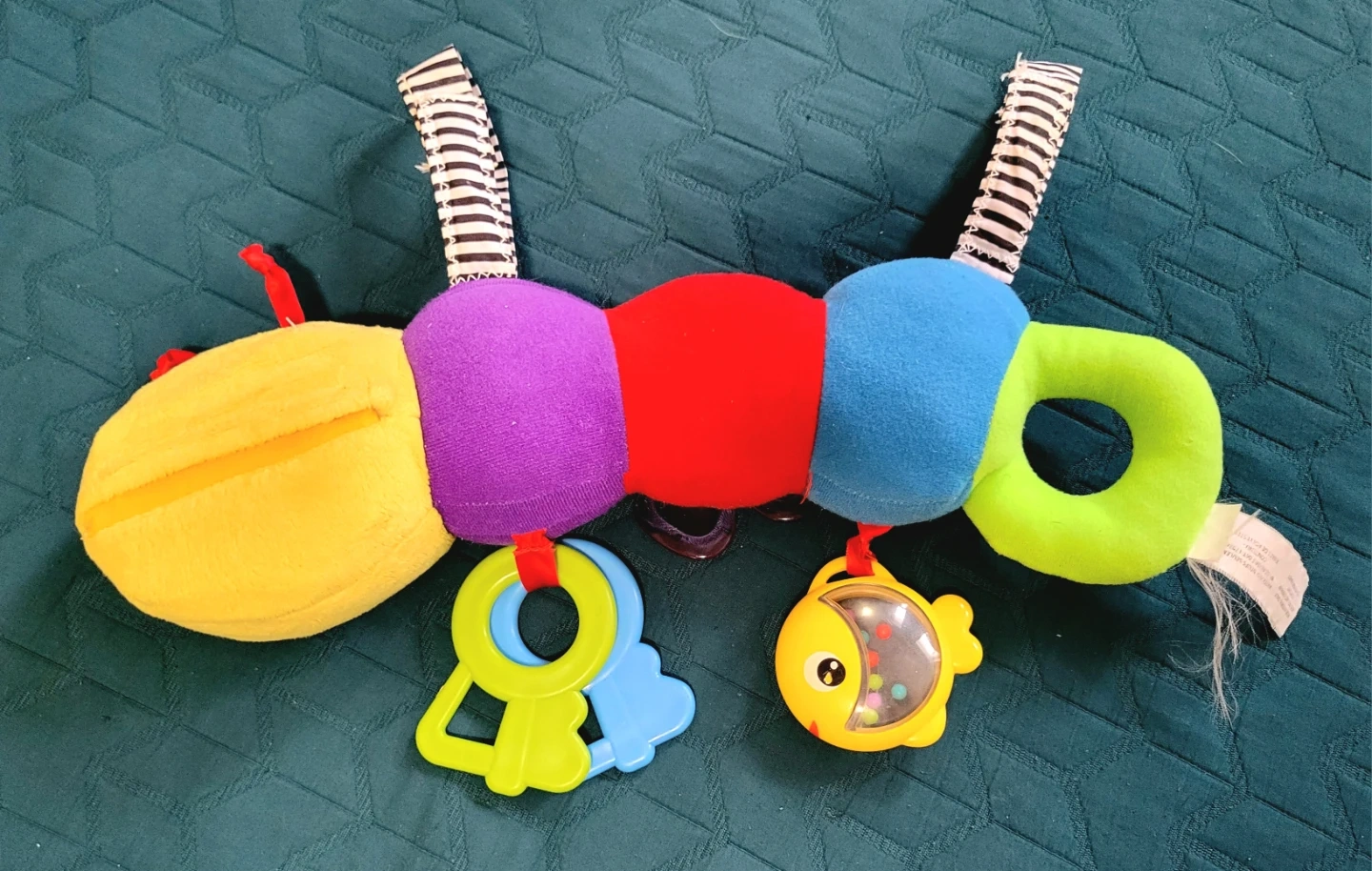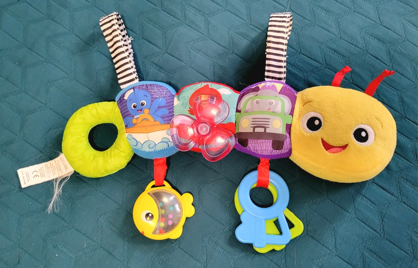 This colourful caterpillar activity toy is designed to engage little ones. It features a crinkle Rattle, a green ring, and a blue teether with a fish-shaped rattle filled with beads.