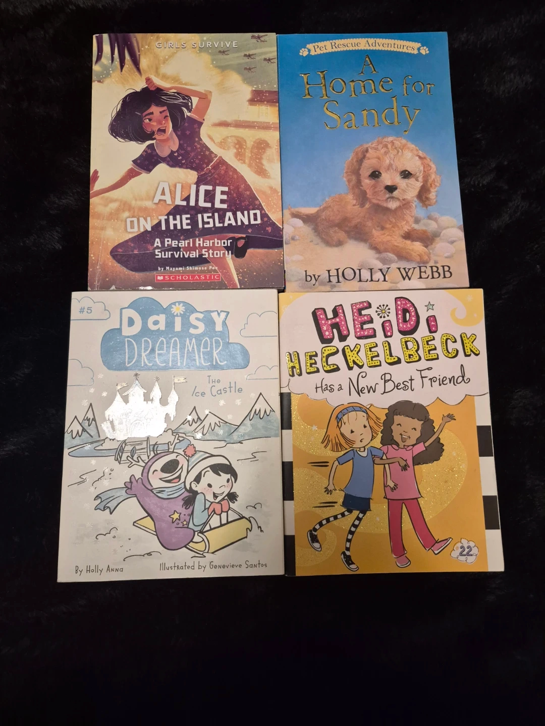 This bundle includes four children's books: 'Alice on the Island' by Mayumi Shimose Poe, 'A Home for Sandy' by Holly Webb, 'Daisy Dreamer: The Ice Castle' by Holly Anna, and 'Heidi Heckelbeck Has a New Best Friend'. These books are great for young readers. $2 per book if buying separately.