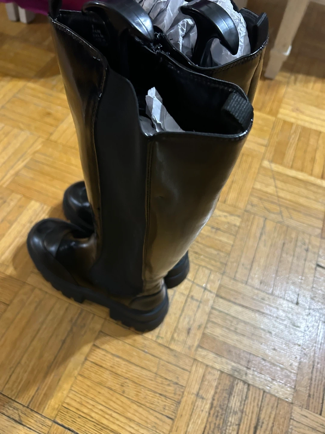 These black knee-high boots have a shiny finish and a lug sole. They feature a side zipper for easy on and off. Perfect for adding a bit of edge to your outfits!