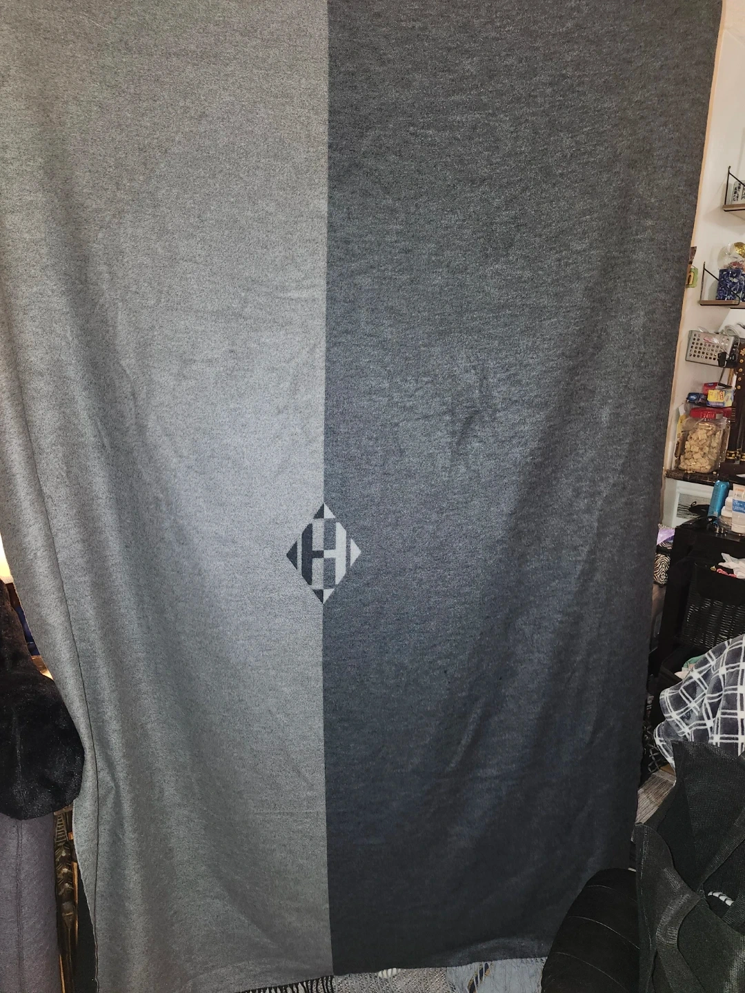 Selling a stylish two-tone throw featuring both Hermes and Louis Vuitton logos! It's made in Italy from 100% cashmere and wool. The blanket is dry clean only. This is a lovely blanket to add a touch of luxury to your home