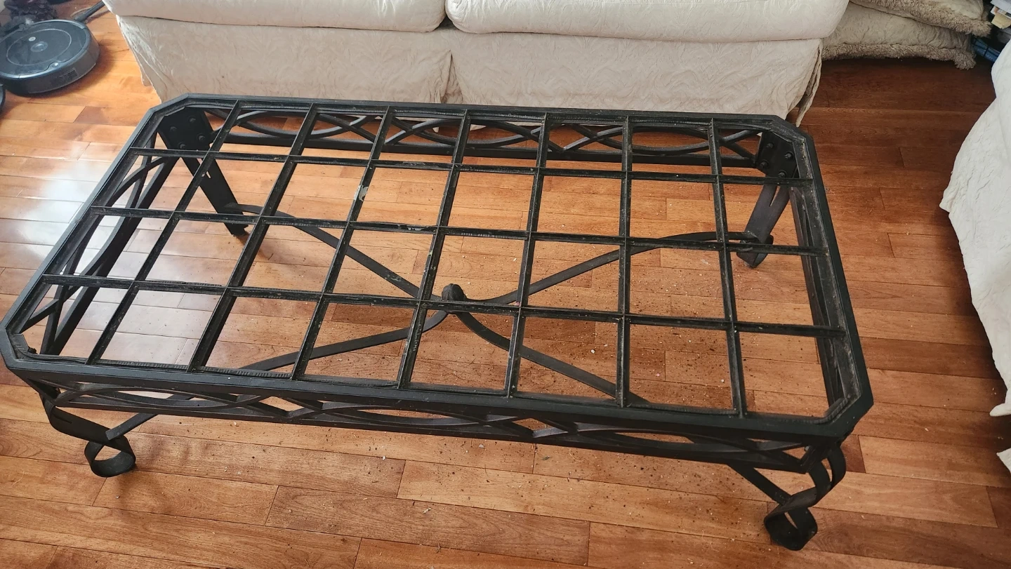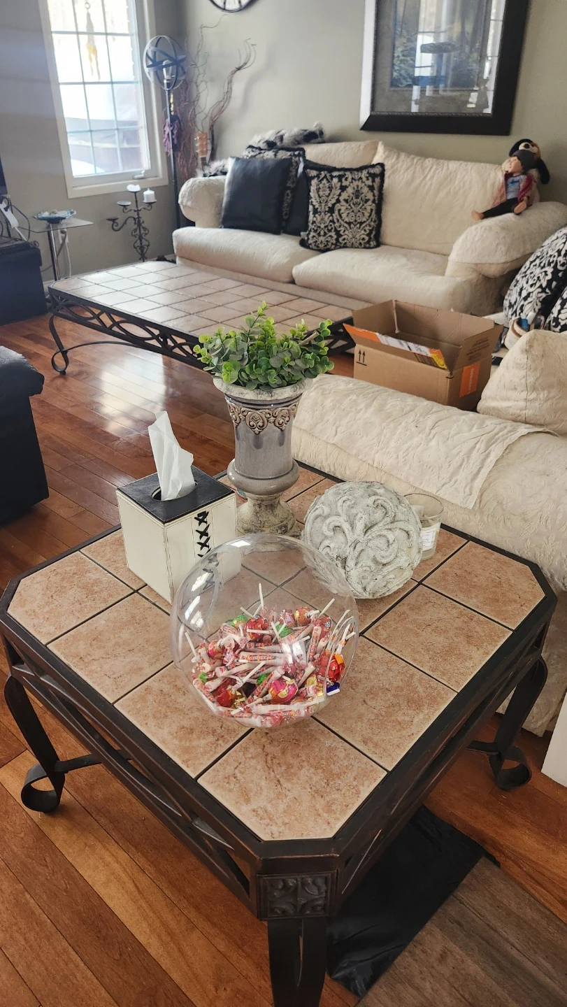 This coffee table features a decorative wrought iron base with a tiled top. It's sturdy and offers a unique look for your living space. The tile inserts are light brown and arranged in a grid pattern. Perfect for holding drinks and decor!