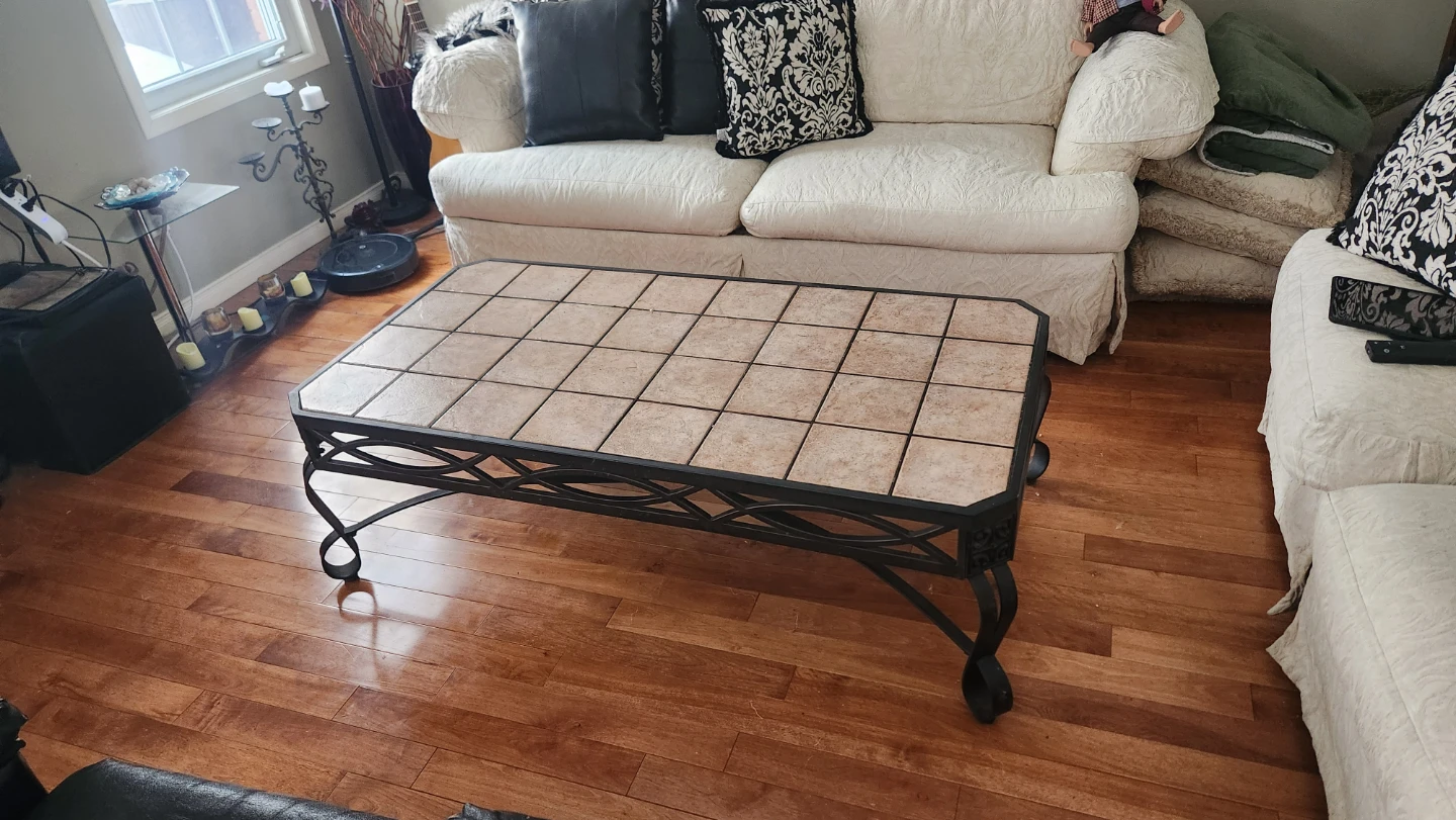 This coffee table features a decorative wrought iron base with a tiled top. It's sturdy and offers a unique look for your living space. The tile inserts are light brown and arranged in a grid pattern. Perfect for holding drinks and decor!