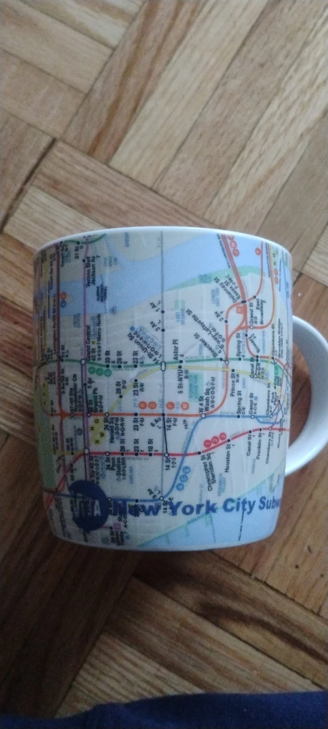 The mug is wrapped in a highly detailed, colorful graphic of the NYC Subway system, featuring iconic stops and lines. Made from New Bone China, it has a more refined, lightweight feel and better translucency than standard ceramic mugs.
