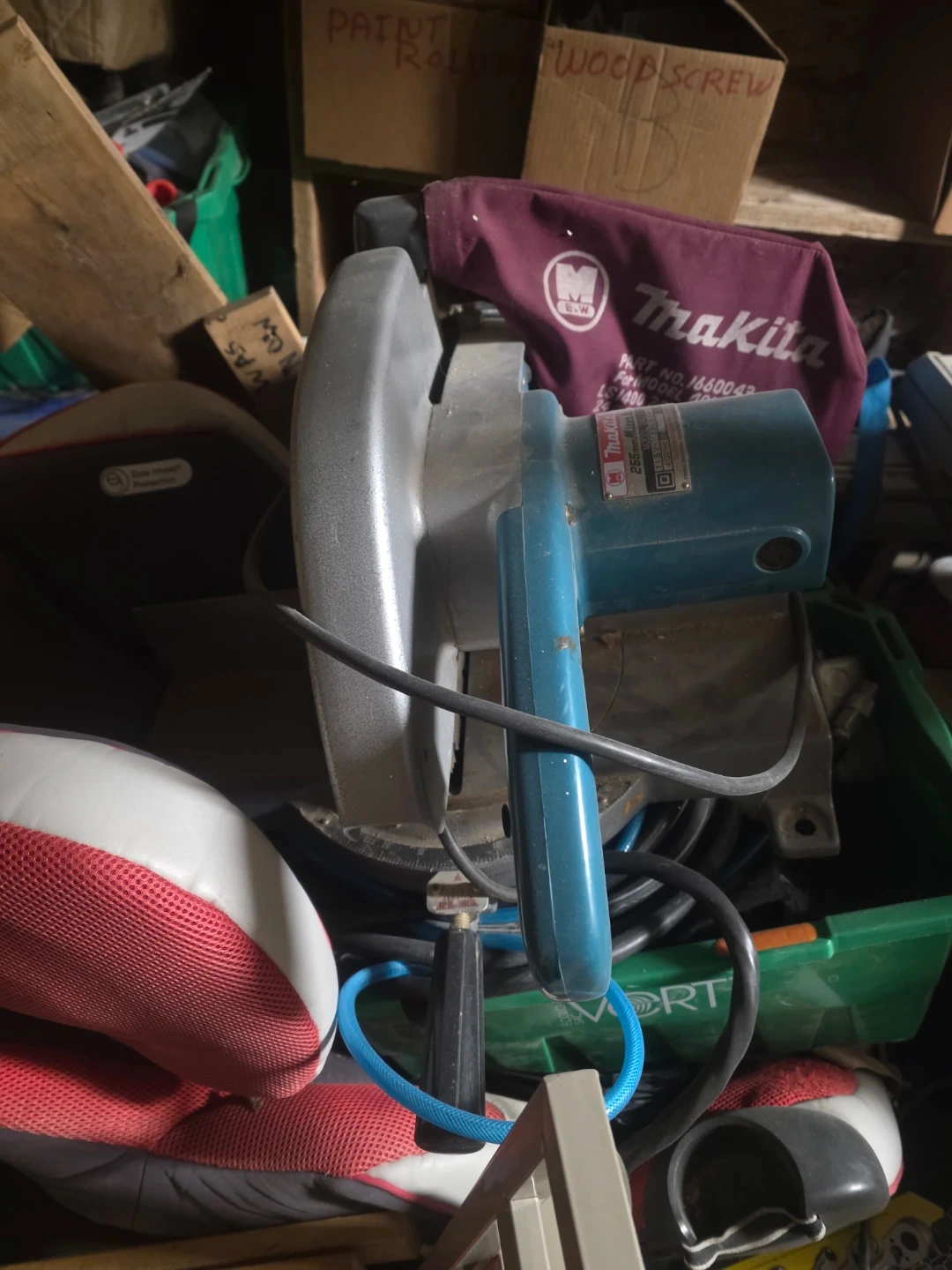 This is a Makita LS1400 sliding compound miter saw. It has a 255mm blade and comes with a dust bag. It's a powerful tool for cutting wood with precision.