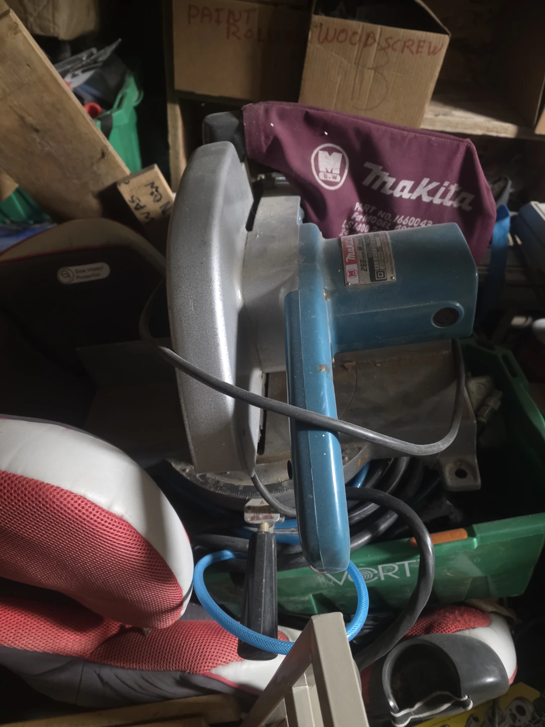 This is a Makita LS1400 sliding compound miter saw. It has a 255mm blade and comes with a dust bag. It's a powerful tool for cutting wood with precision.