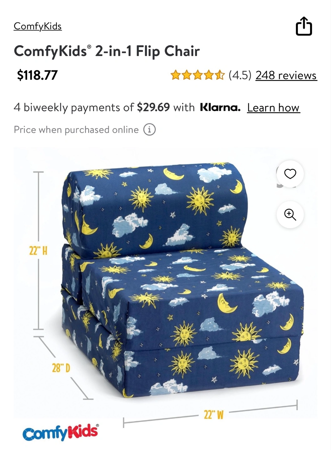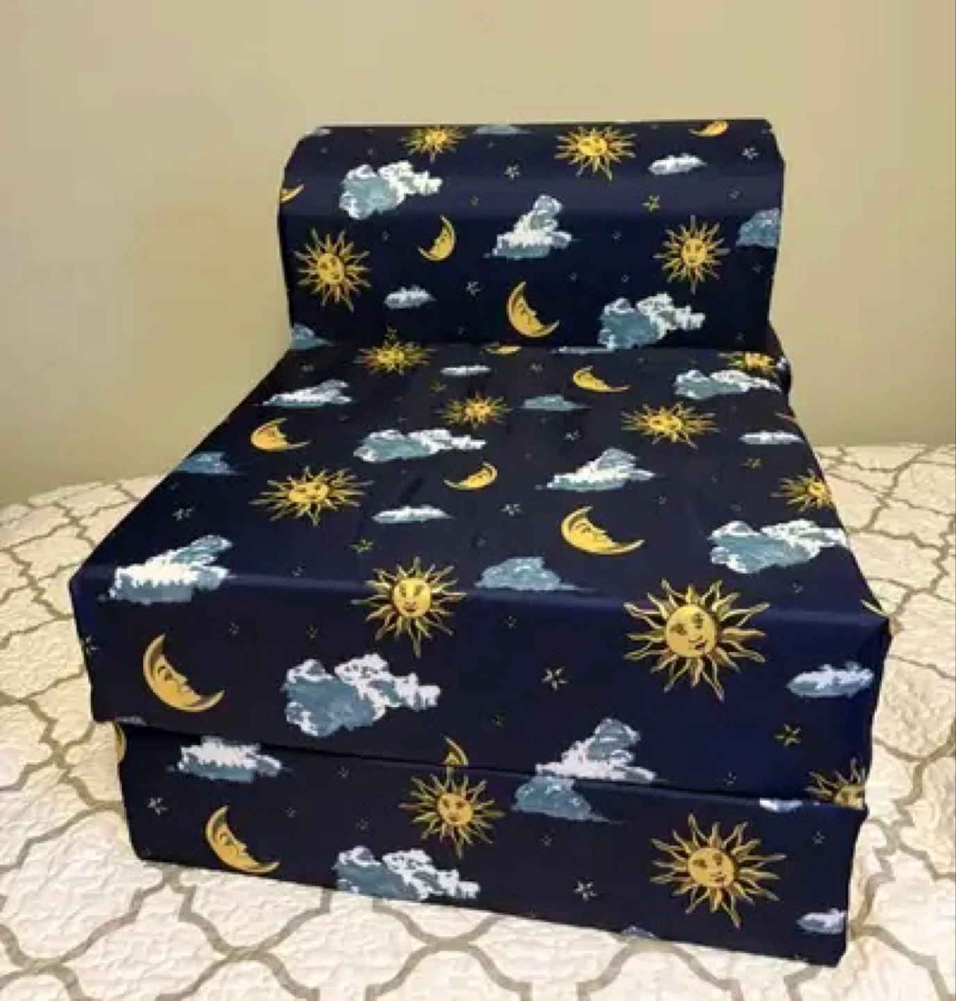 Child's 2-in-1 flip chair. Features a fun sun and moon print. Folds easily for storage.