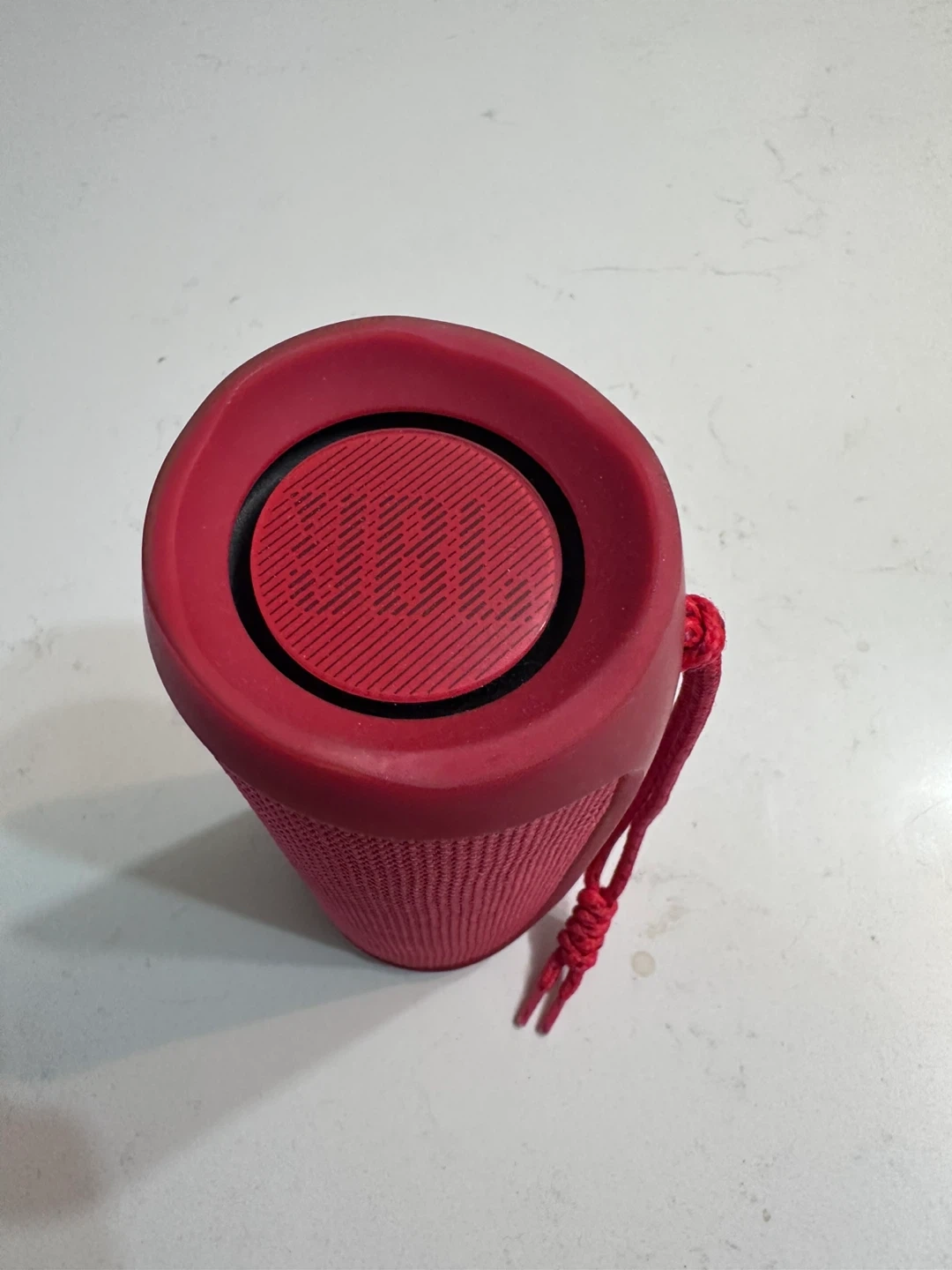 It's a JBL Flip 4 portable Bluetooth speaker in red. This speaker is waterproof and has a durable fabric design. It's great for outdoor use or taking your tunes on the go!